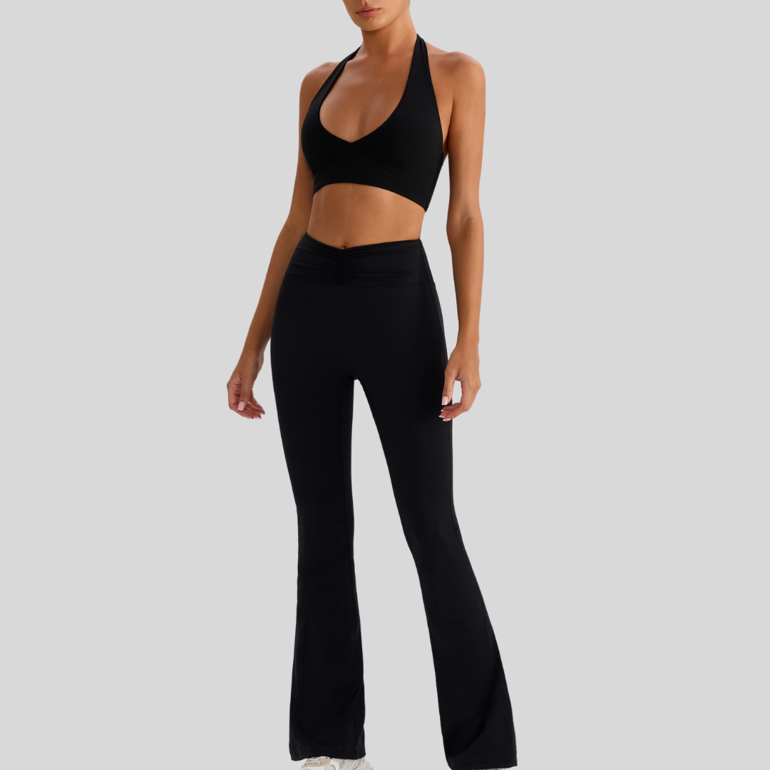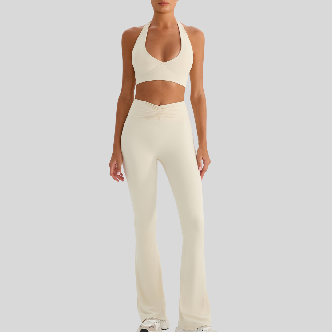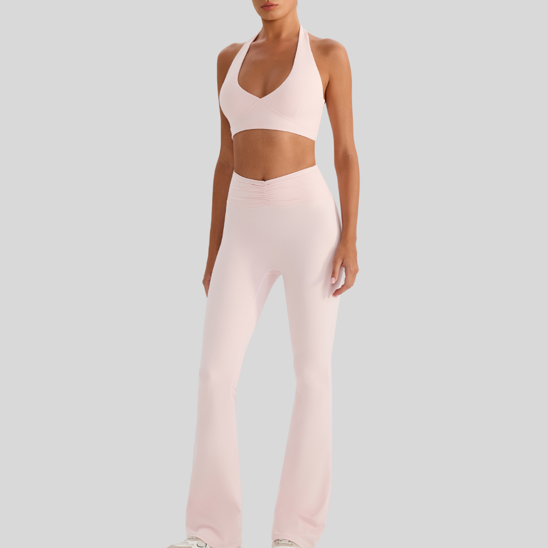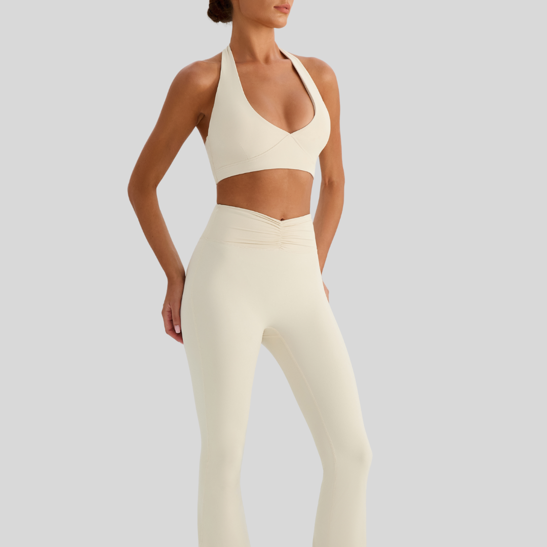 The Bea Set is built to flatter—featuring a halter sports bra and flared leggings with a ruched waistband for a touch of detail. Align Fabric (75% nylon + 25% spandex) gives it a smooth, breathable, and ultra-comfy feel.