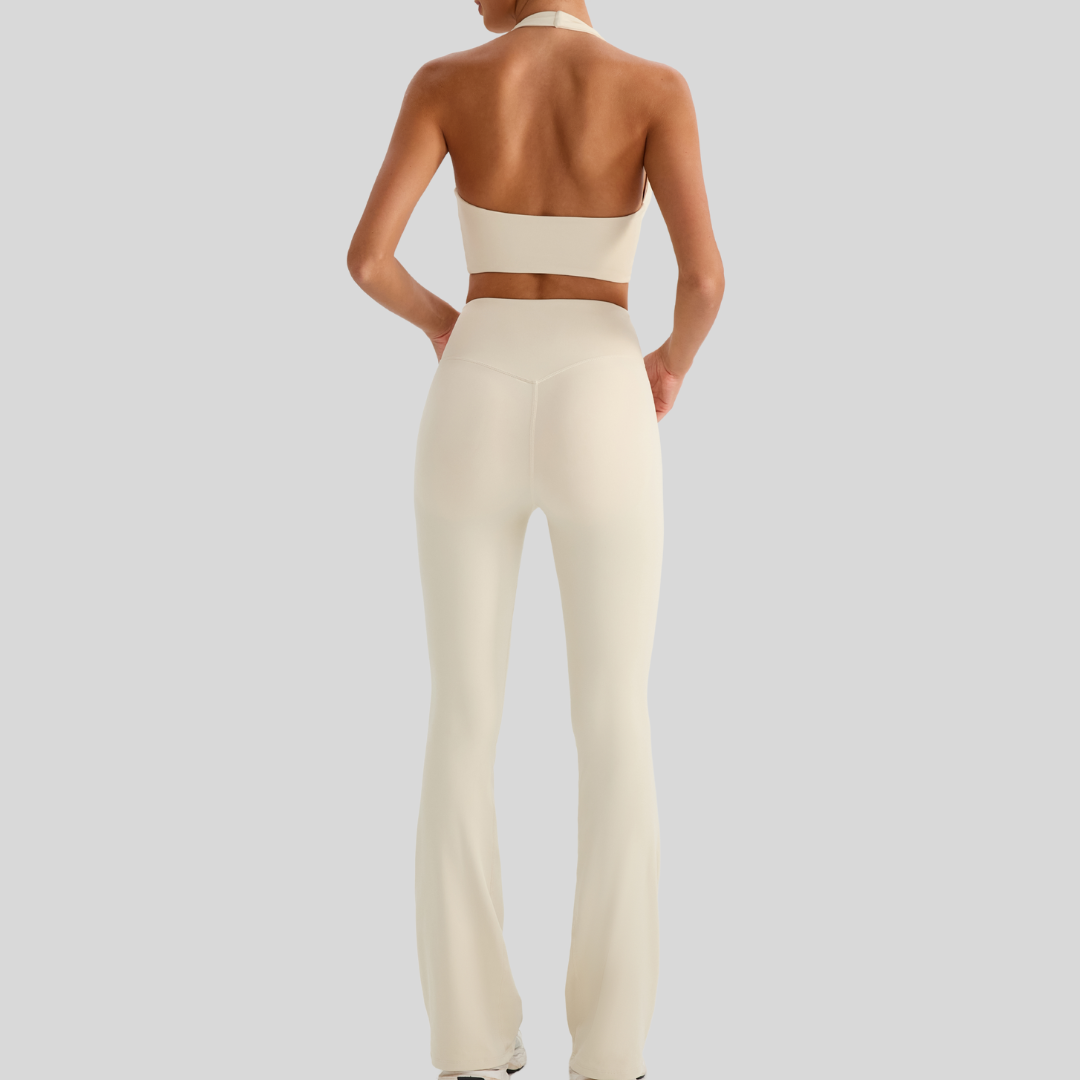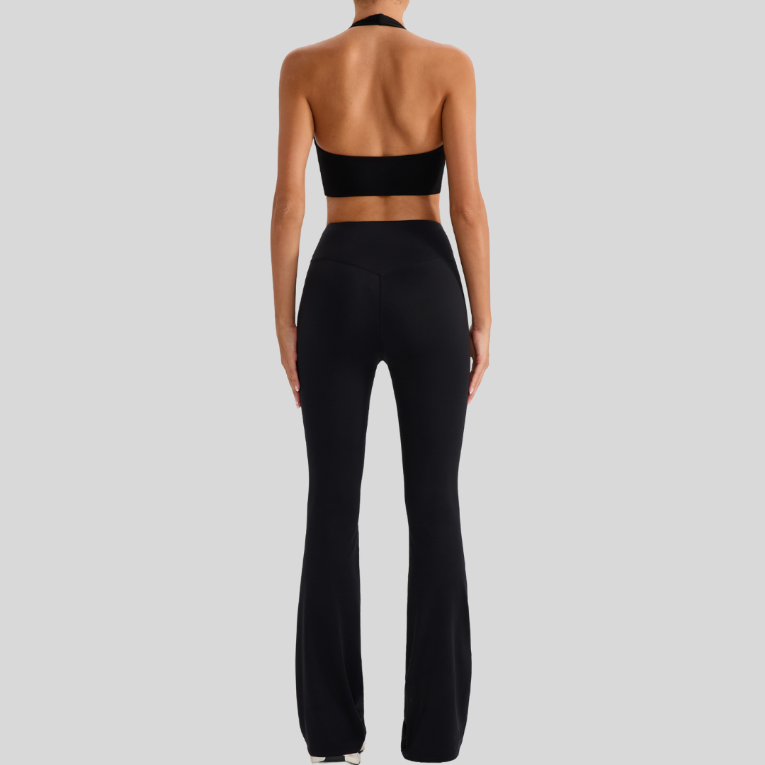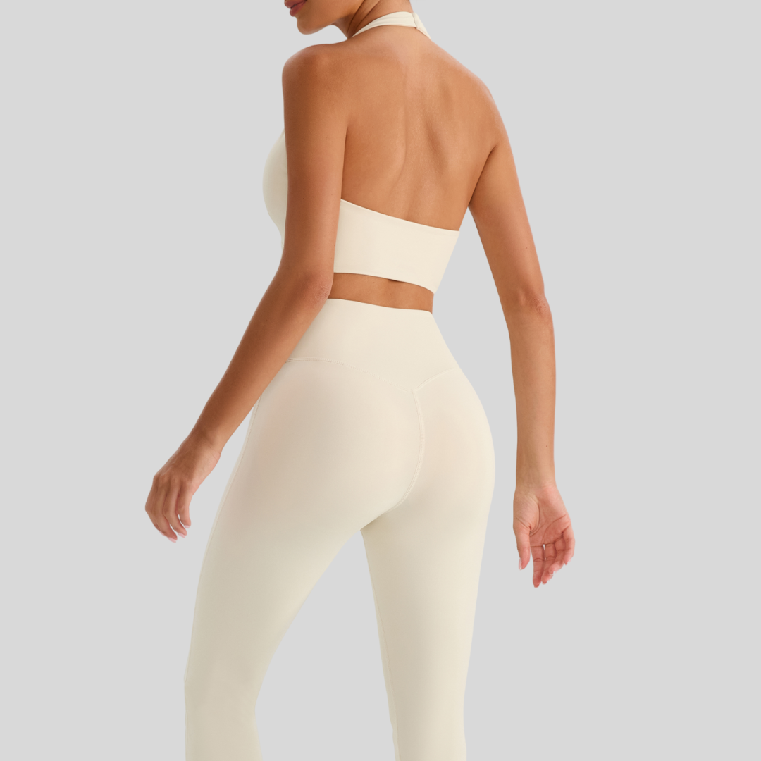 The Bea Set is built to flatter—featuring a halter sports bra and flared leggings with a ruched waistband for a touch of detail. Align Fabric (75% nylon + 25% spandex) gives it a smooth, breathable, and ultra-comfy feel.