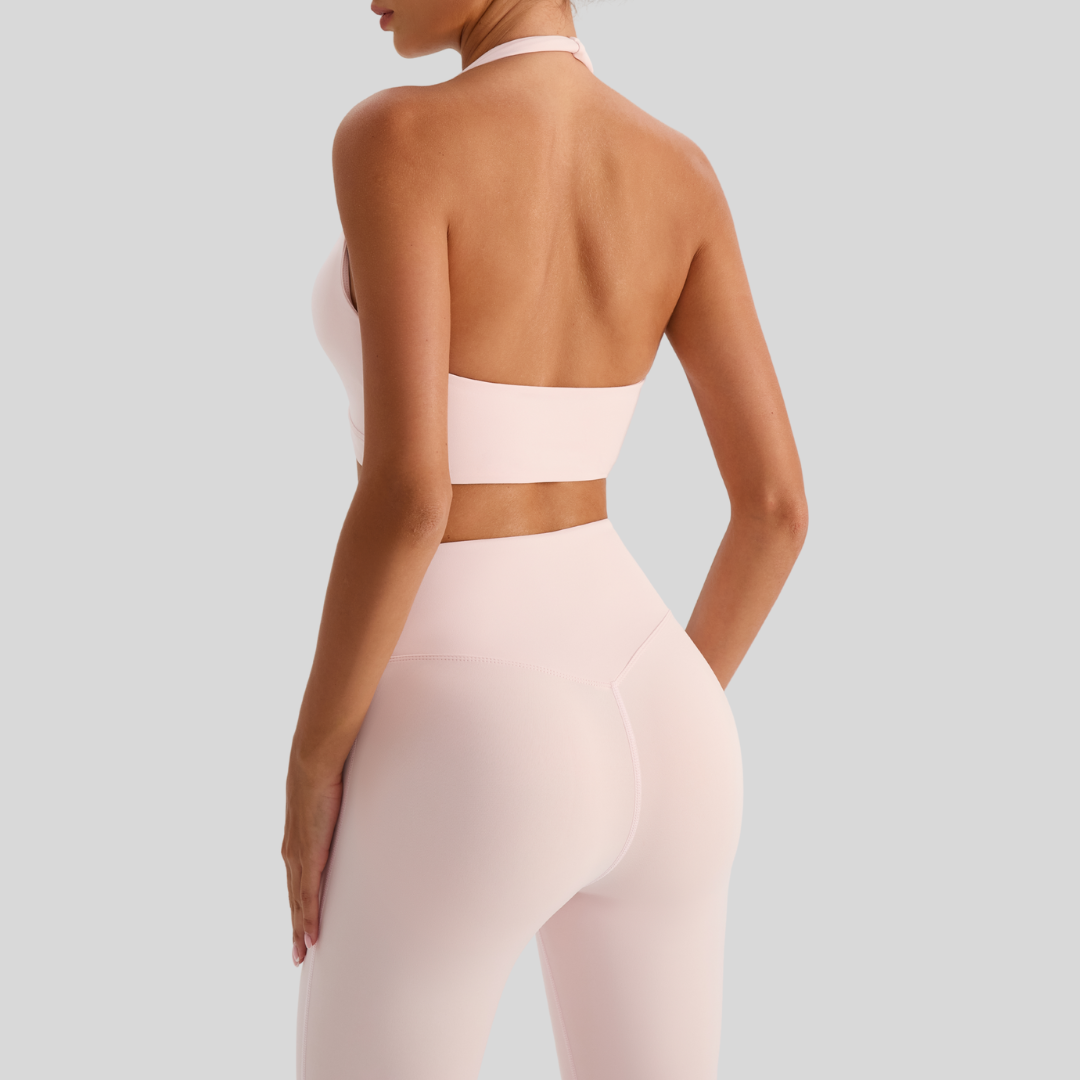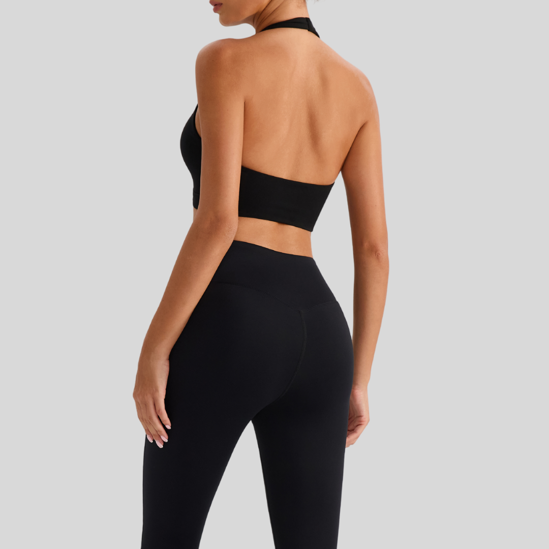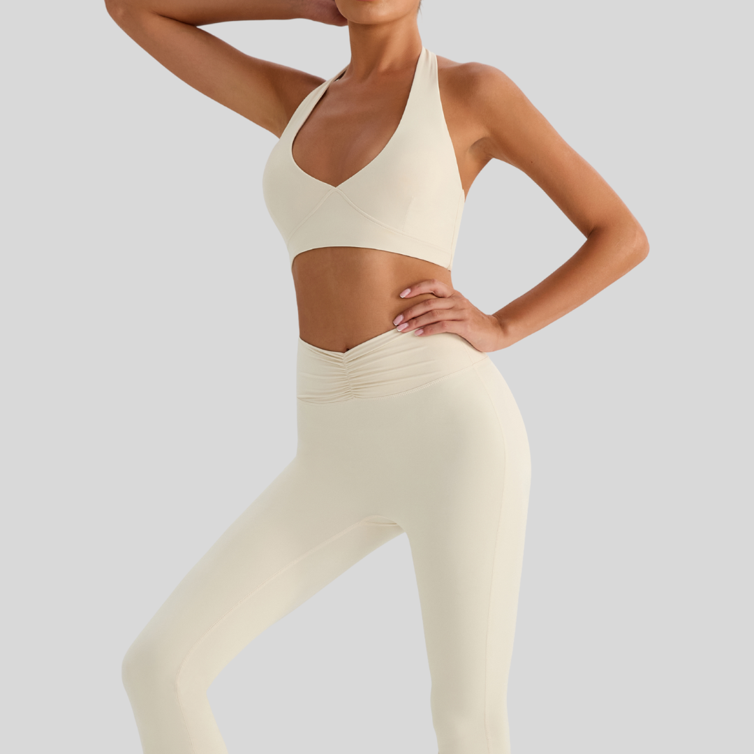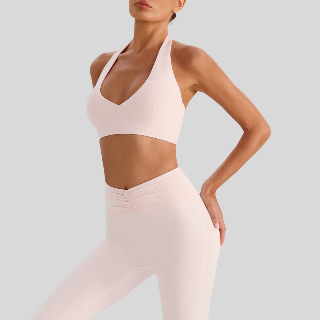 The Bea Set is built to flatter—featuring a halter sports bra and flared leggings with a ruched waistband for a touch of detail. Align Fabric (75% nylon + 25% spandex) gives it a smooth, breathable, and ultra-comfy feel.