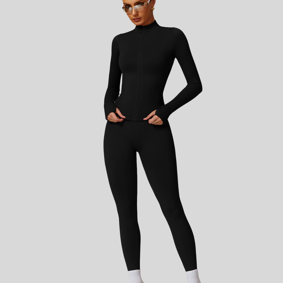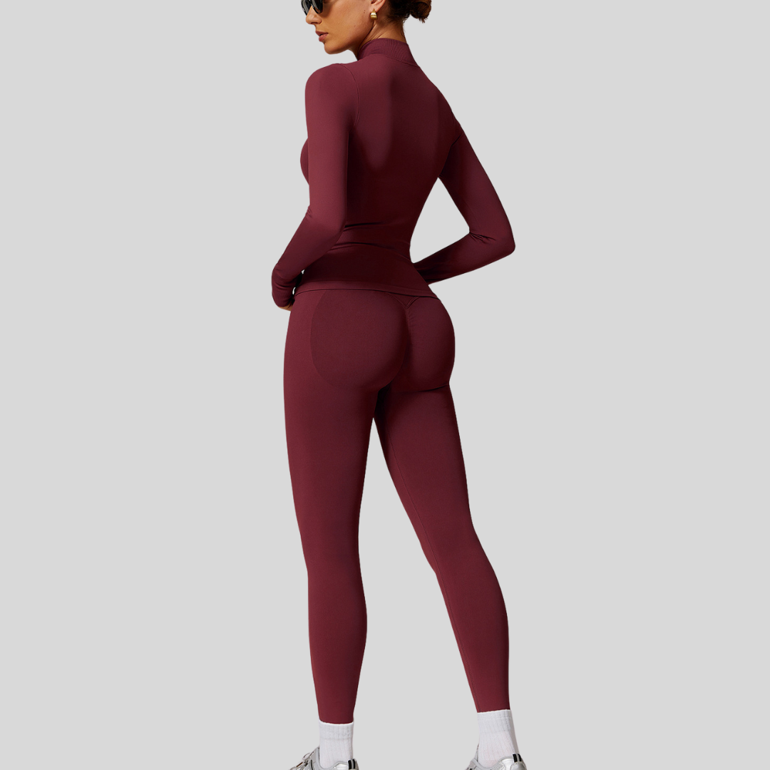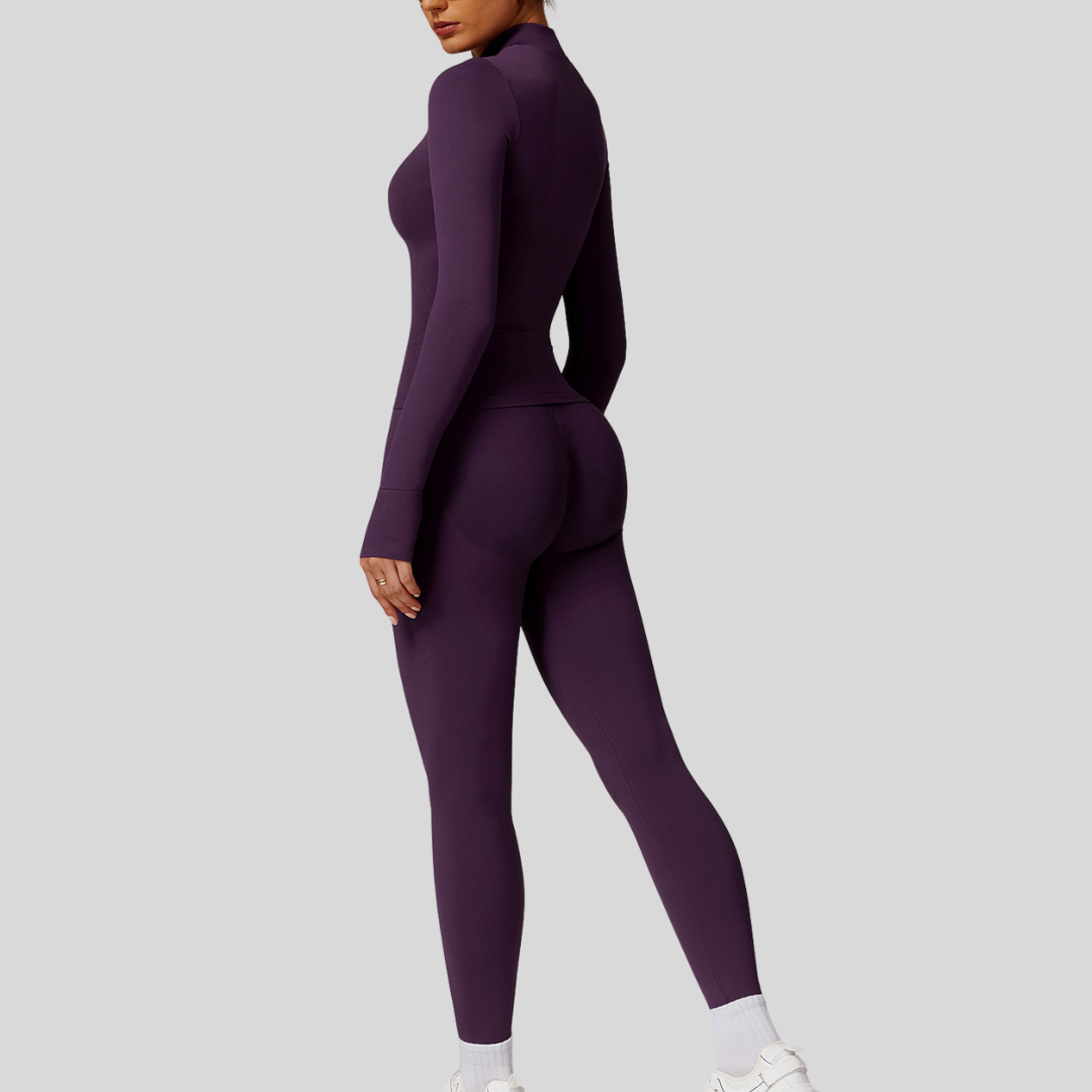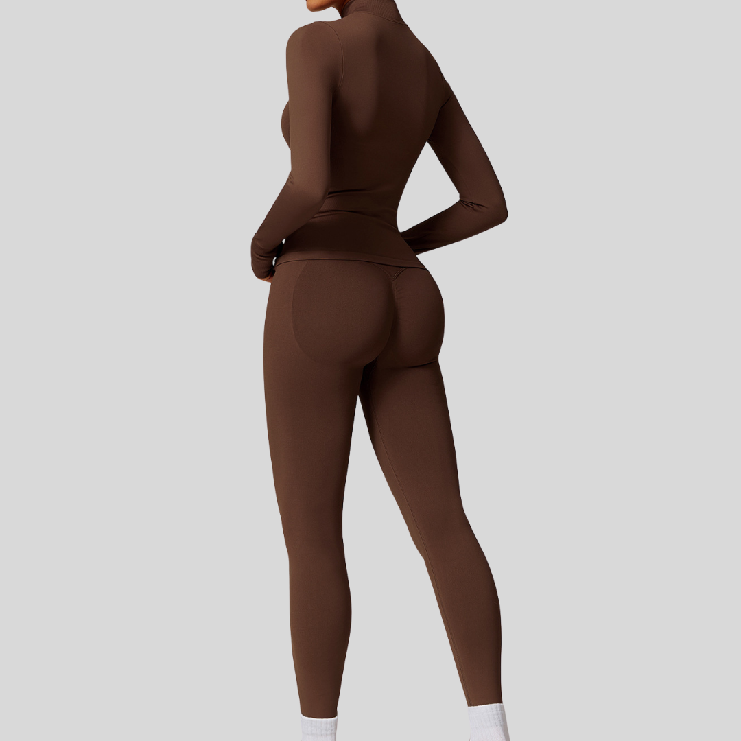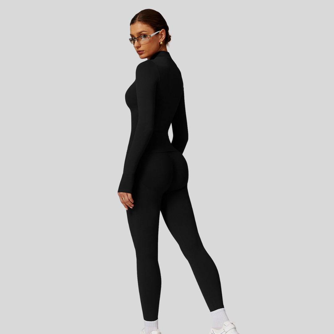 The Cloe set is your go-to for polished comfort. With its fitted jacket and sculpting leggings, it’s all about minimal design with maximum impact. The subtle ruched back seam adds a touch of shape and lift that enhances your natural curves.