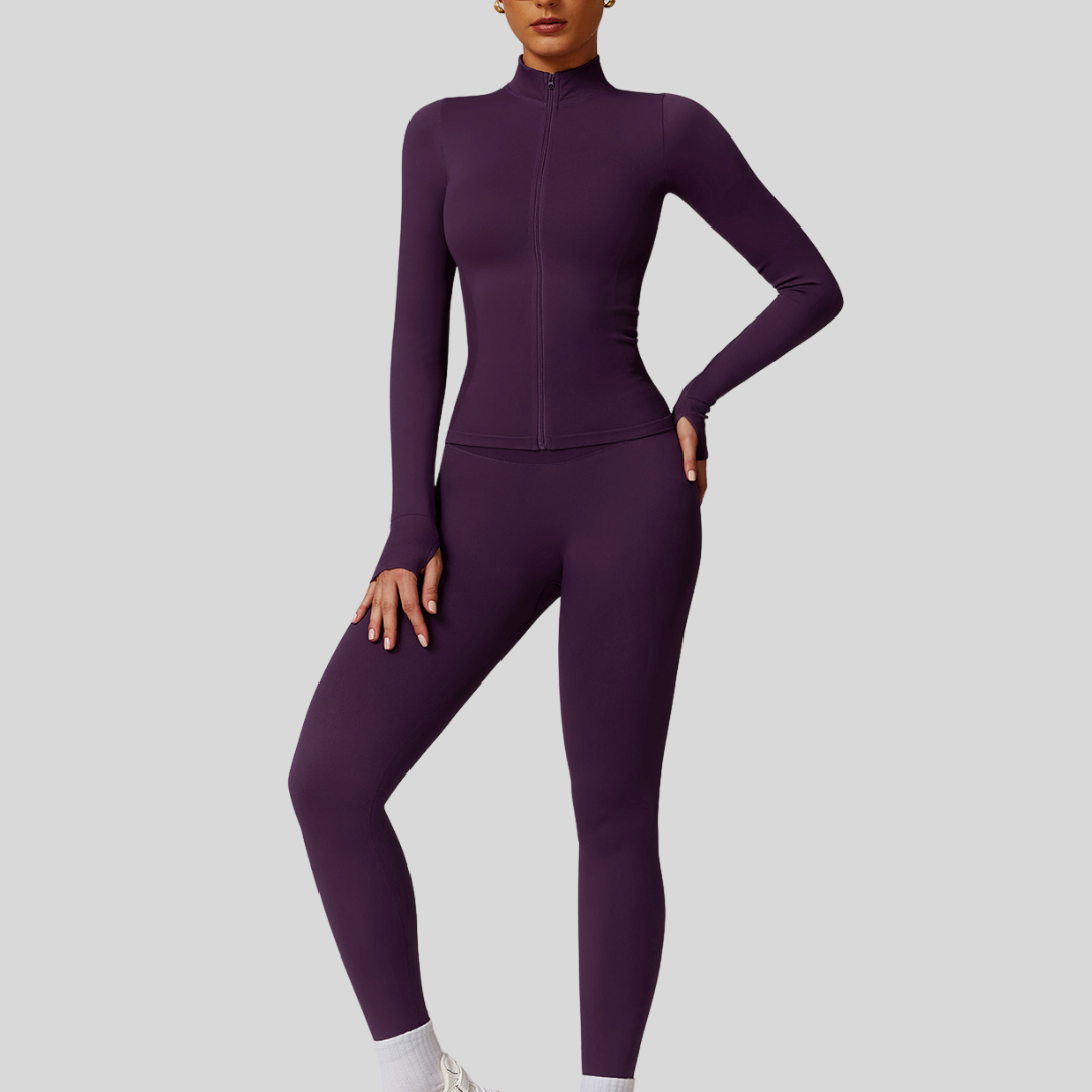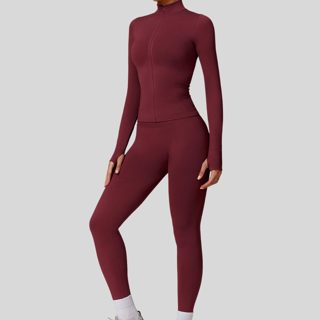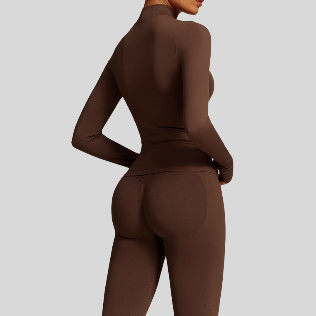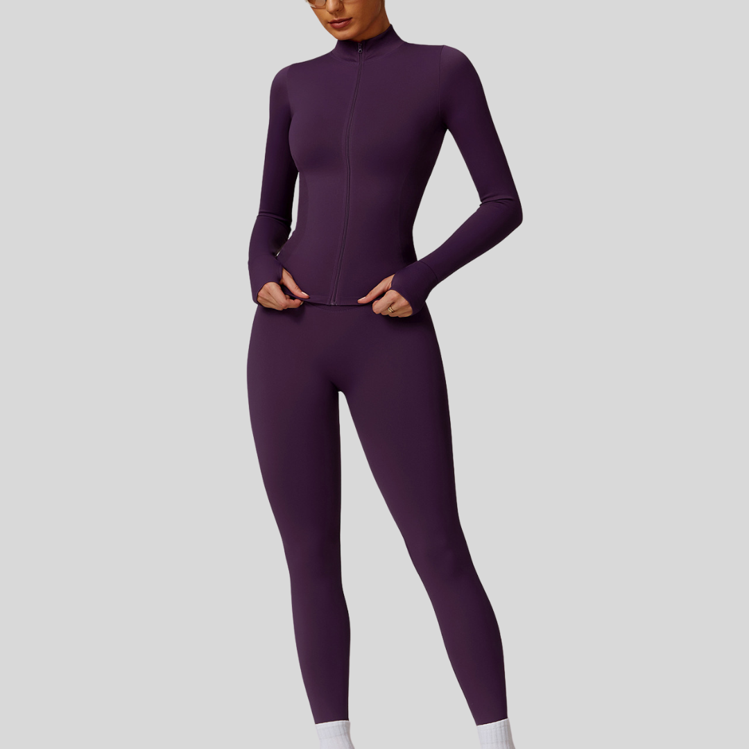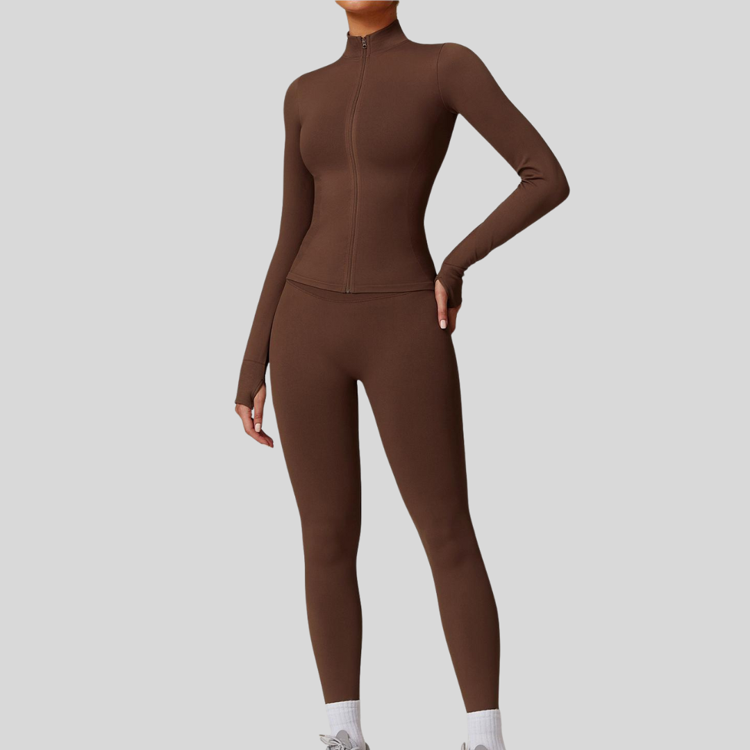 The Cloe set is your go-to for polished comfort. With its fitted jacket and sculpting leggings, it’s all about minimal design with maximum impact. The subtle ruched back seam adds a touch of shape and lift that enhances your natural curves.