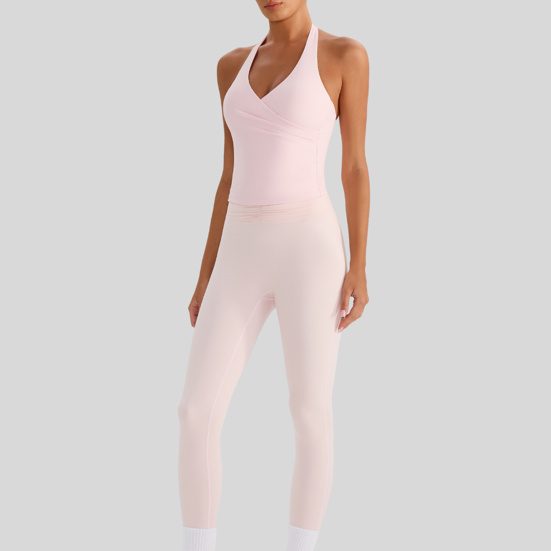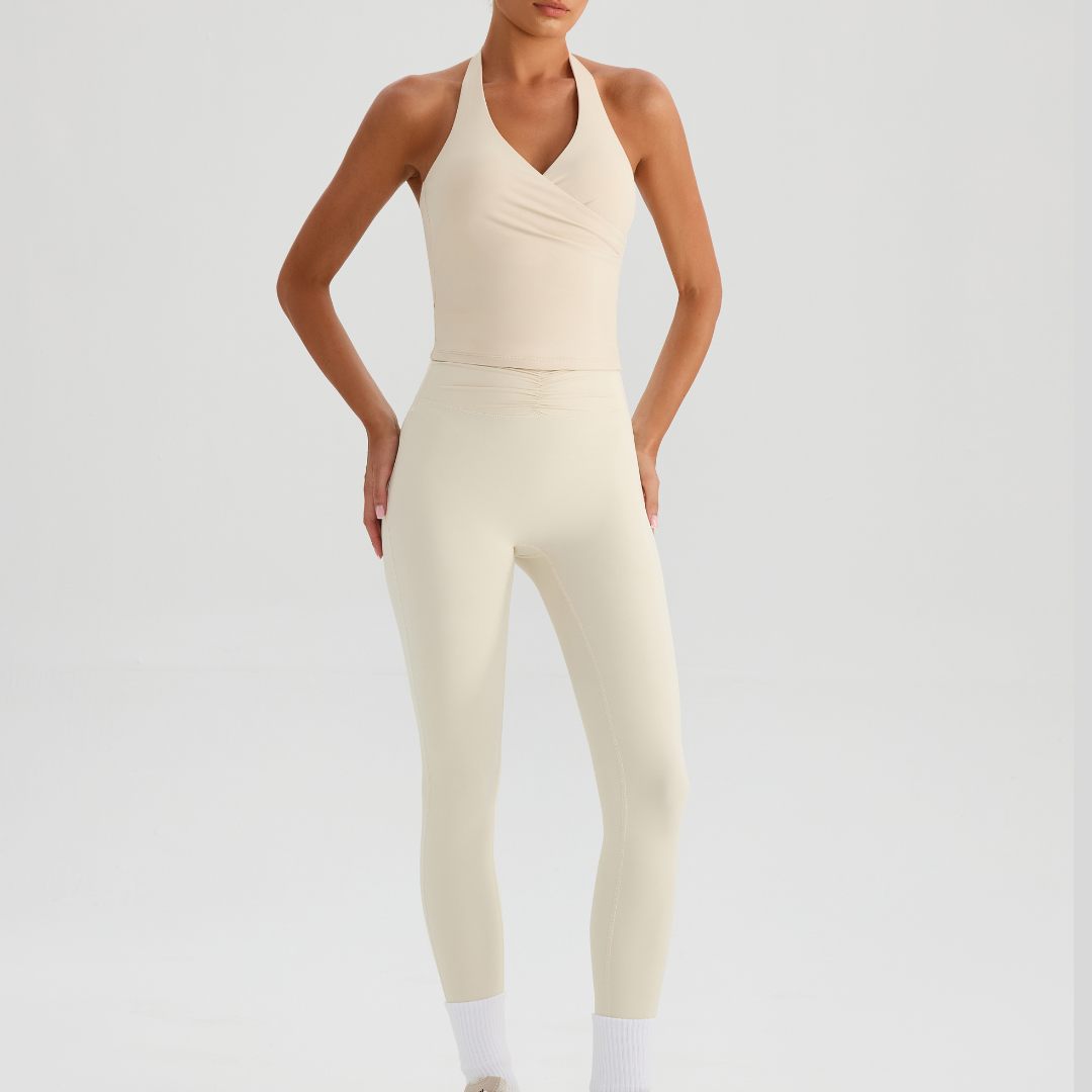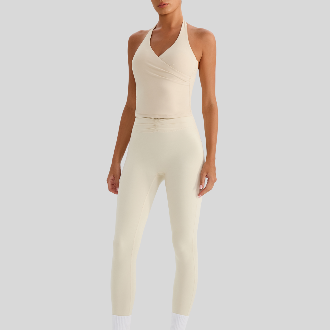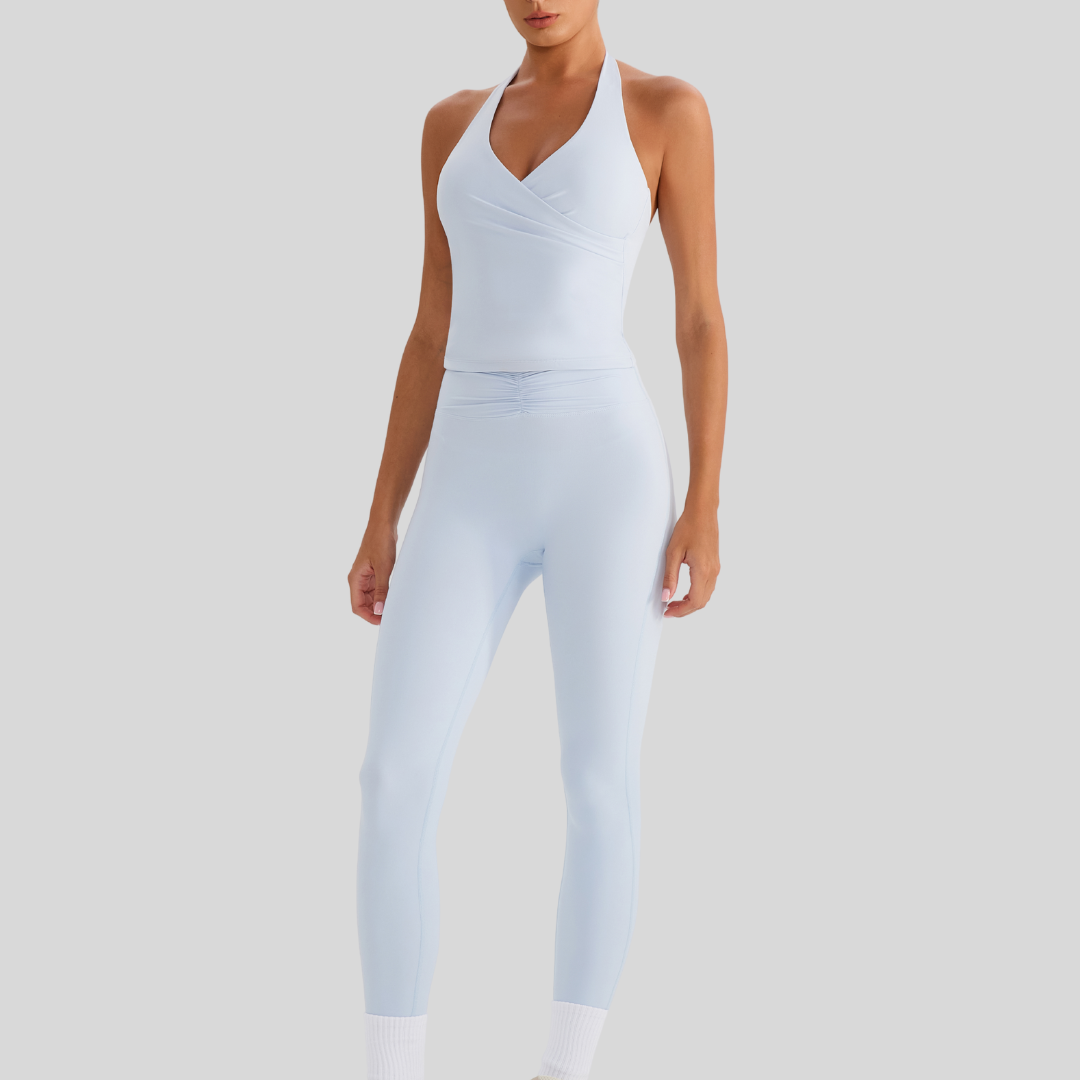 Bella is a halter top and leggings duo designed to make you feel amazing. With its sleek wrap neckline and ruched high-rise leggings, it blends chic style with effortless comfort. The Align Fabric (75% nylon + 25% spandex) makes it smooth, flexible, and ready for anything.