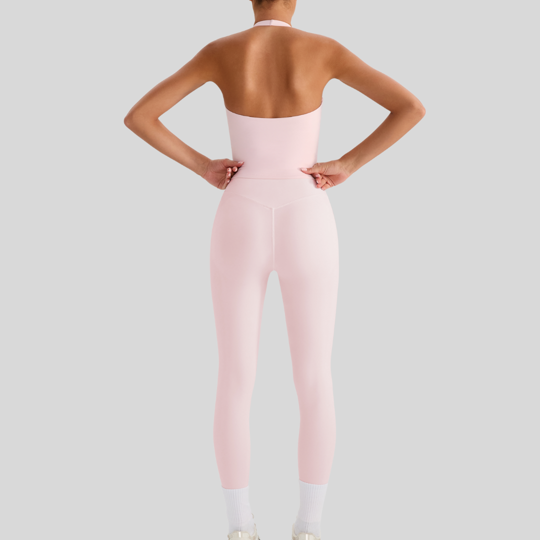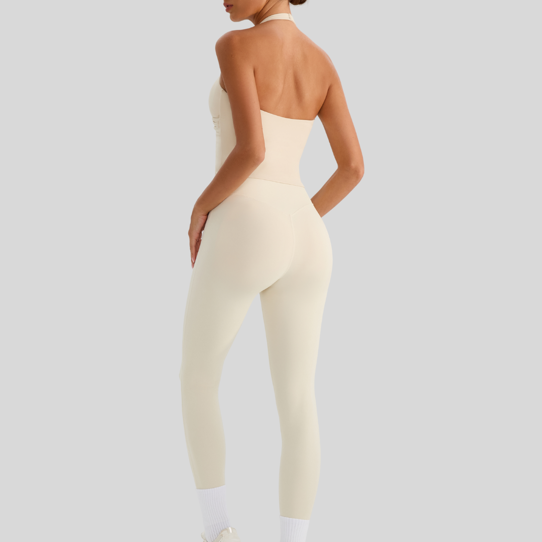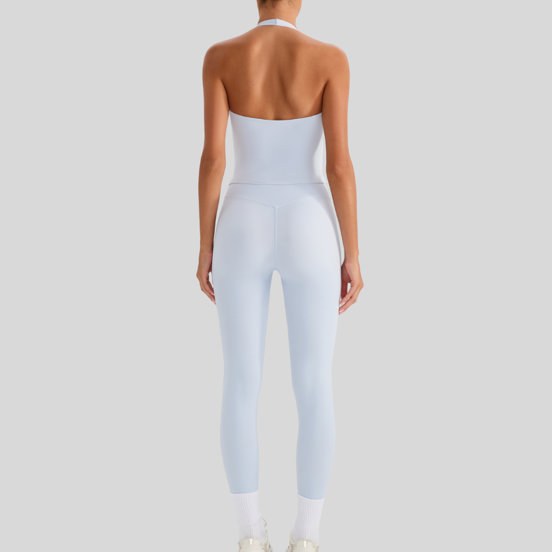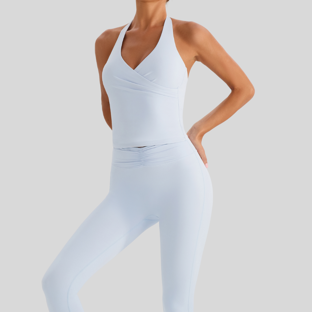 Bella is a halter top and leggings duo designed to make you feel amazing. With its sleek wrap neckline and ruched high-rise leggings, it blends chic style with effortless comfort. The Align Fabric (75% nylon + 25% spandex) makes it smooth, flexible, and ready for anything.