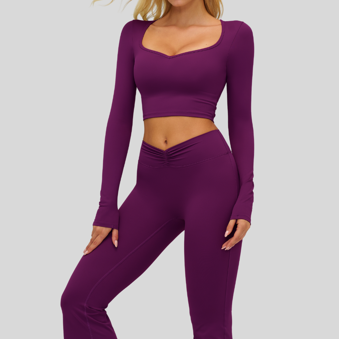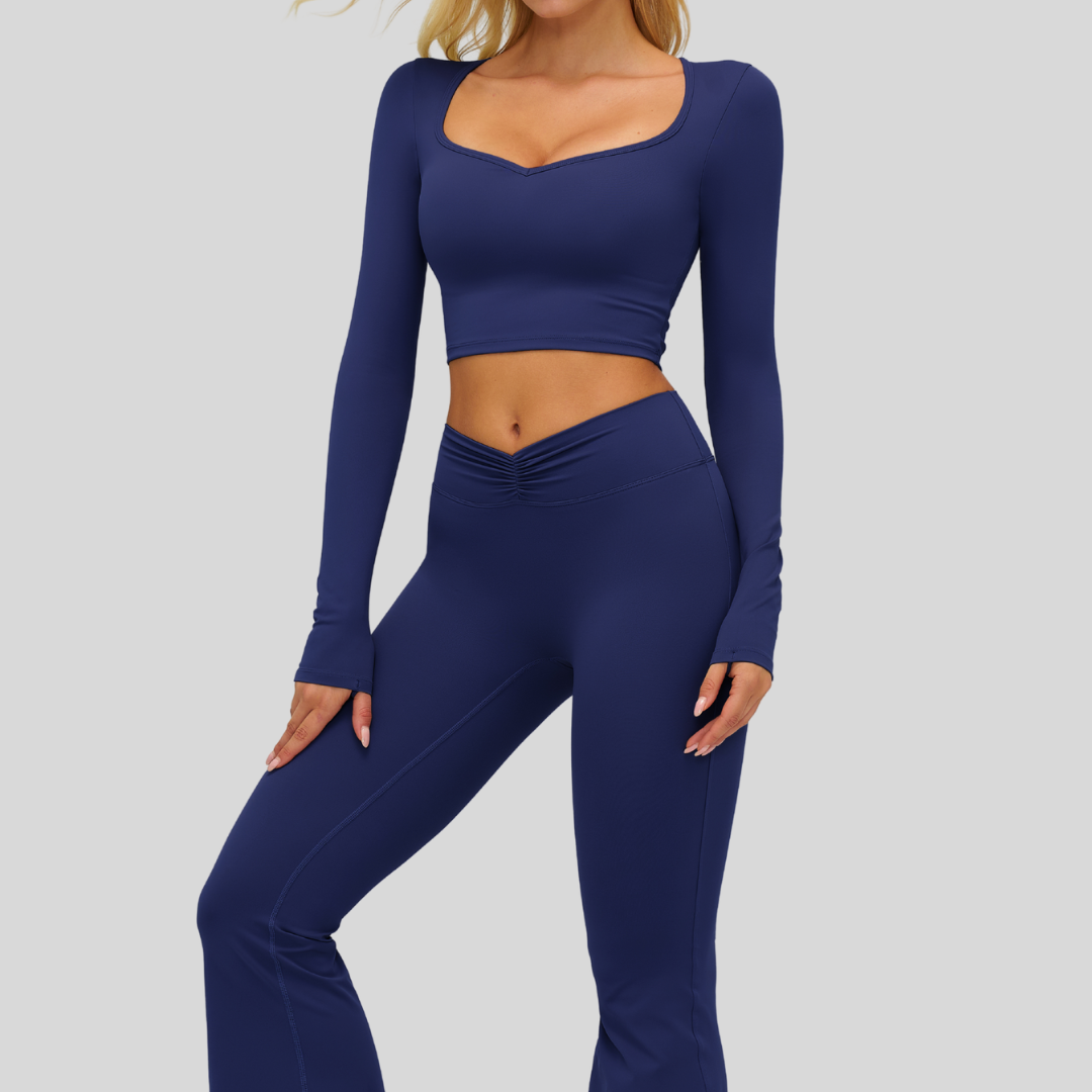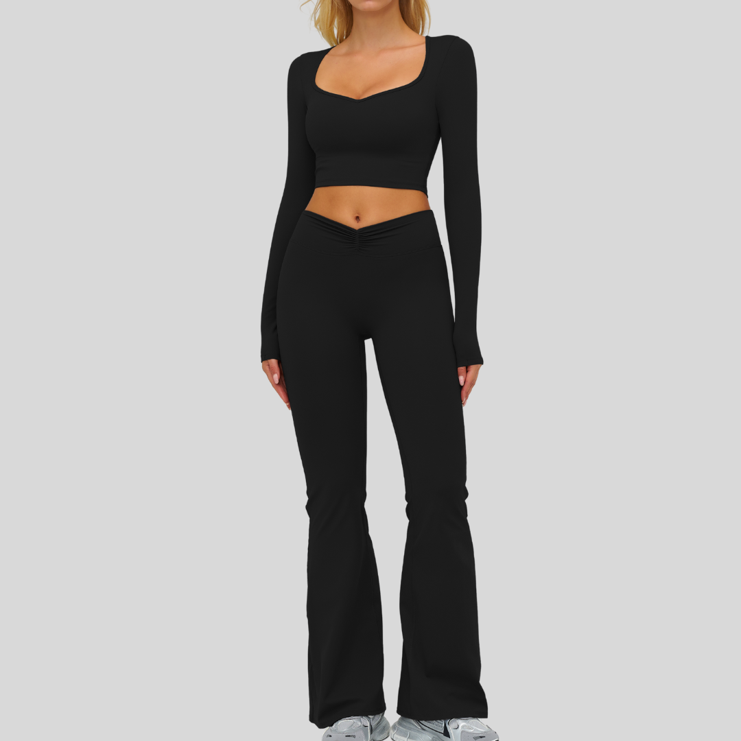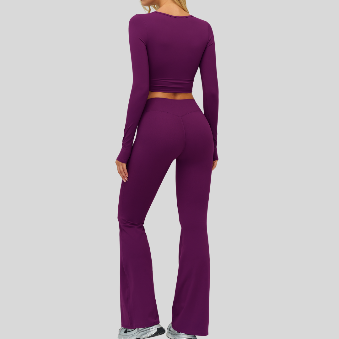Designed for fluid movement and feminine structure. Désirée brings together a sleek long sleeve top and softly flared leggings that elevate your everyday activewear.