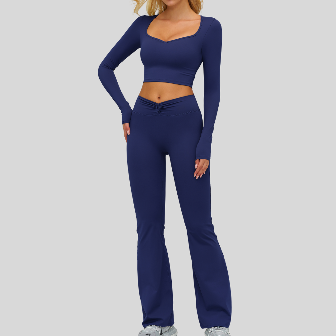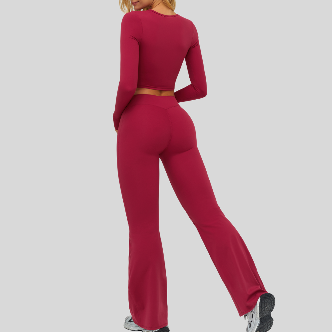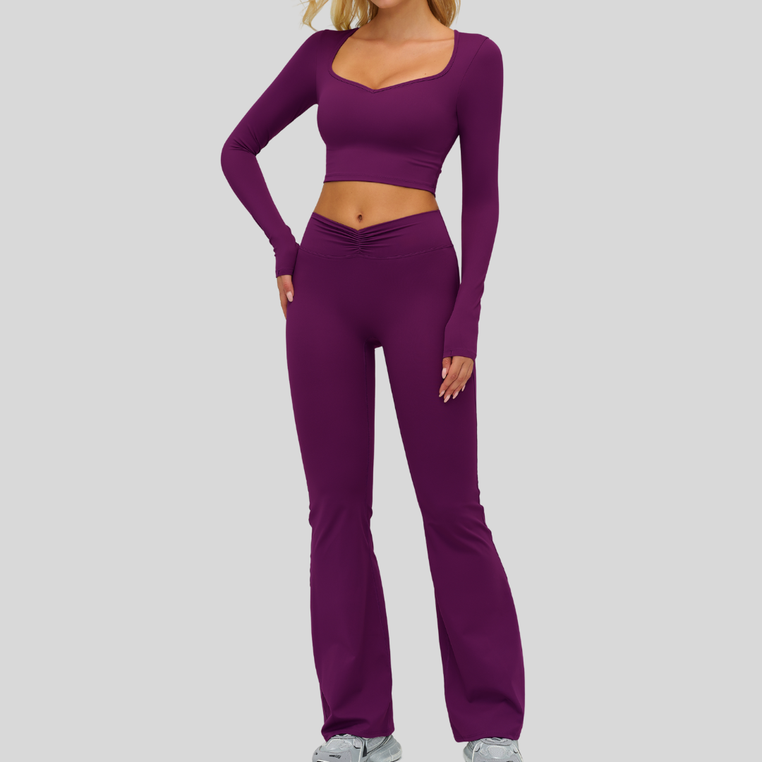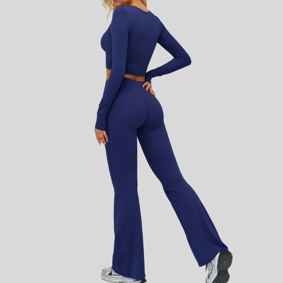 Designed for fluid movement and feminine structure. Désirée brings together a sleek long sleeve top and softly flared leggings that elevate your everyday activewear.