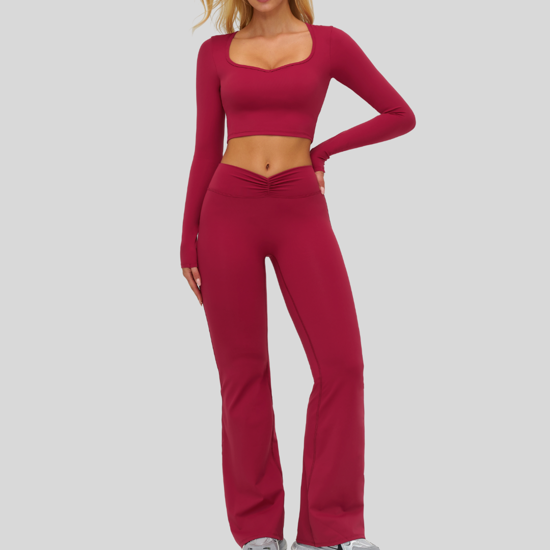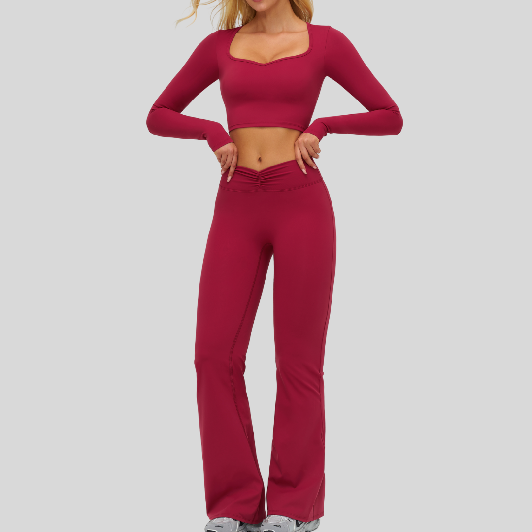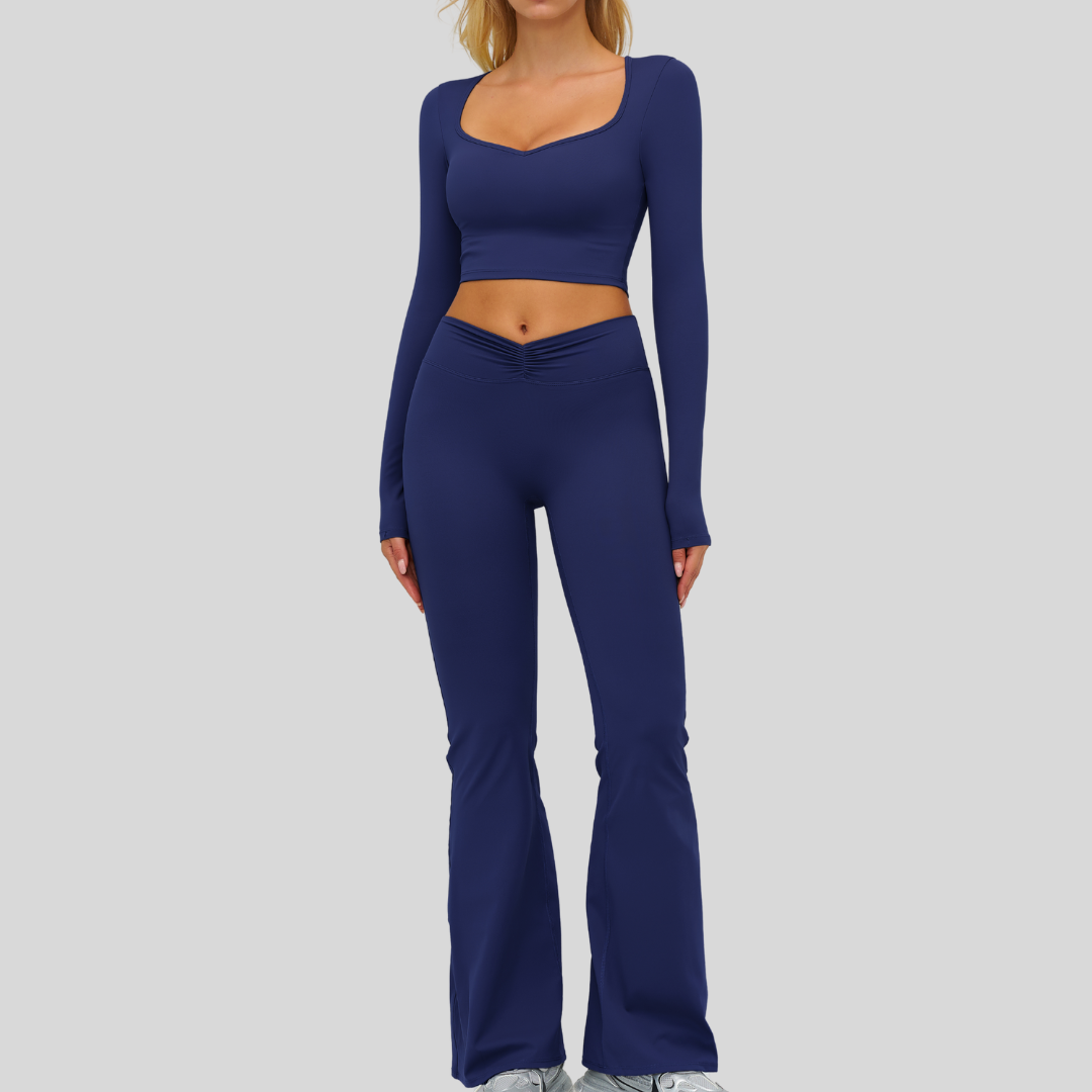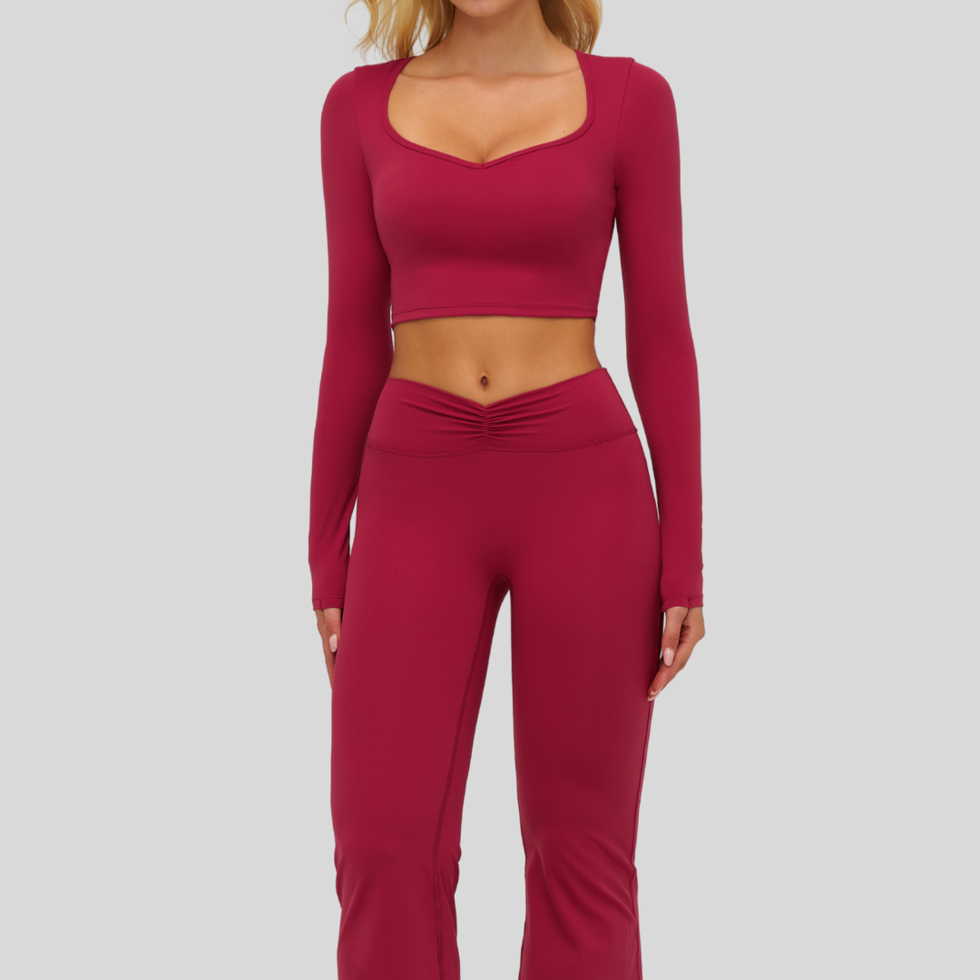 Designed for fluid movement and feminine structure. Désirée brings together a sleek long sleeve top and softly flared leggings that elevate your everyday activewear.