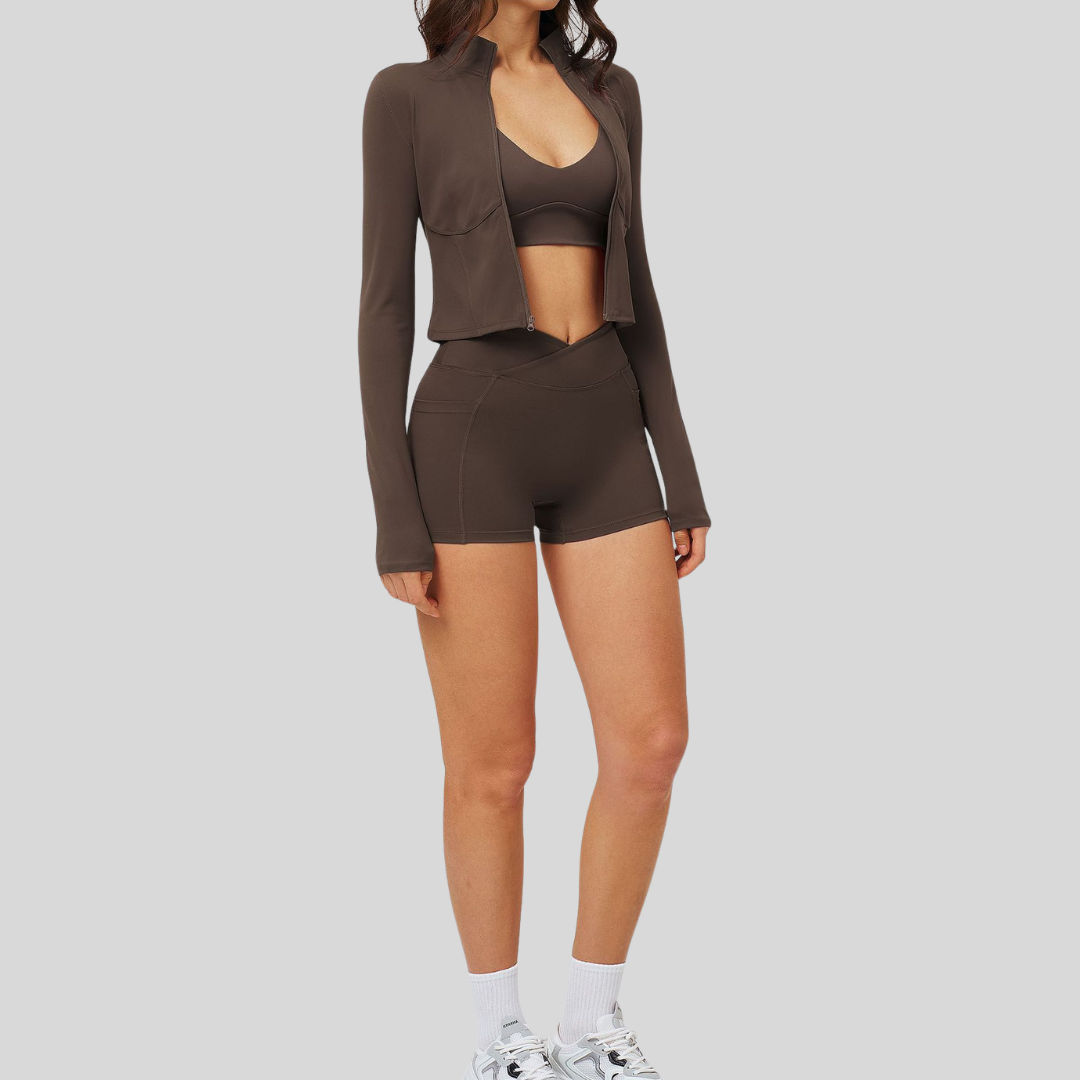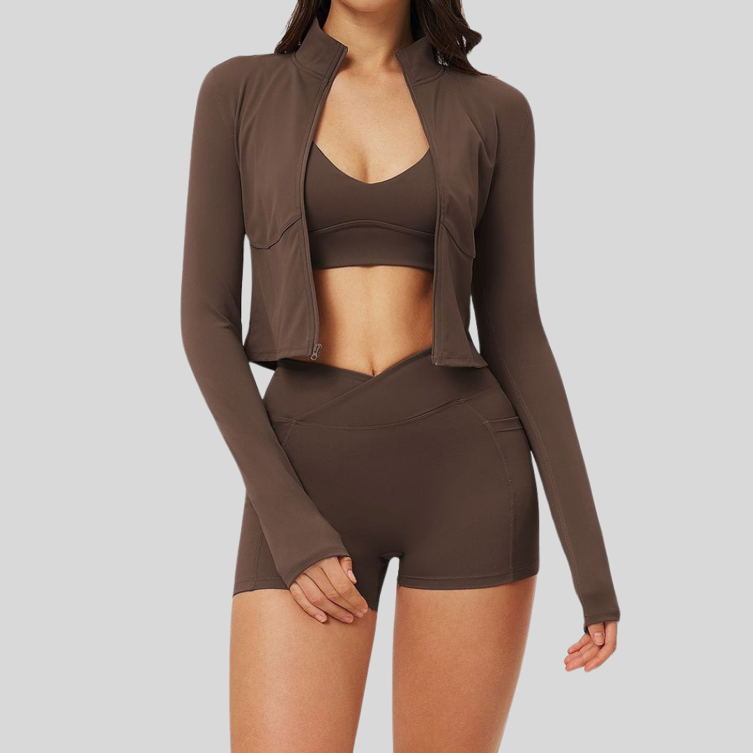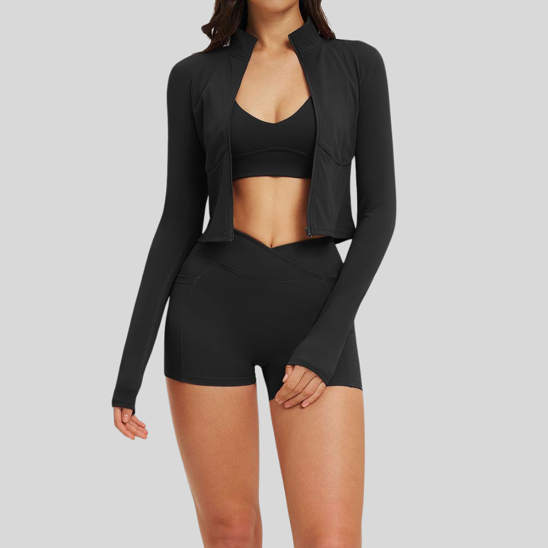 ✔ Complete 3-Piece Look – Jacket, bra, and shorts in one set.