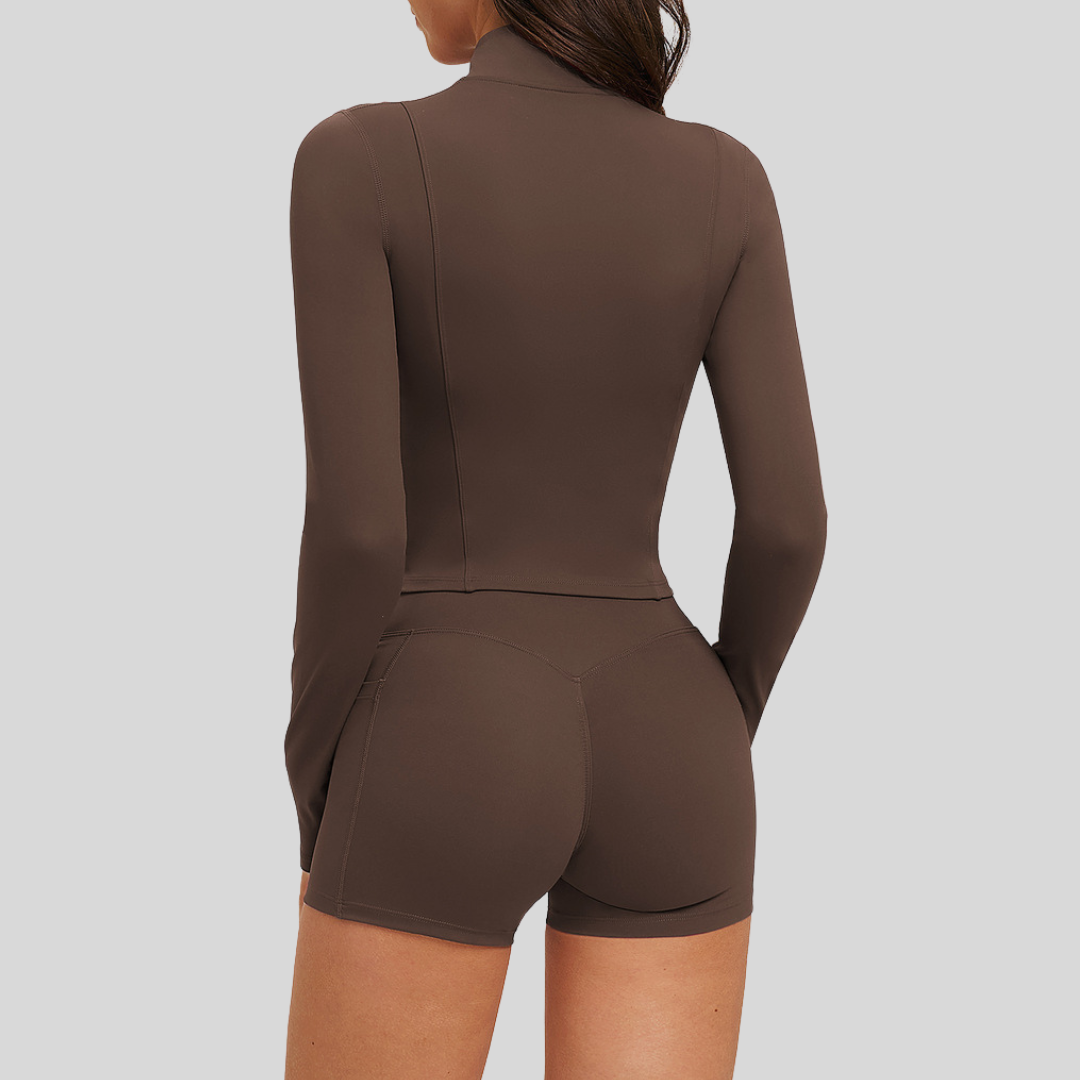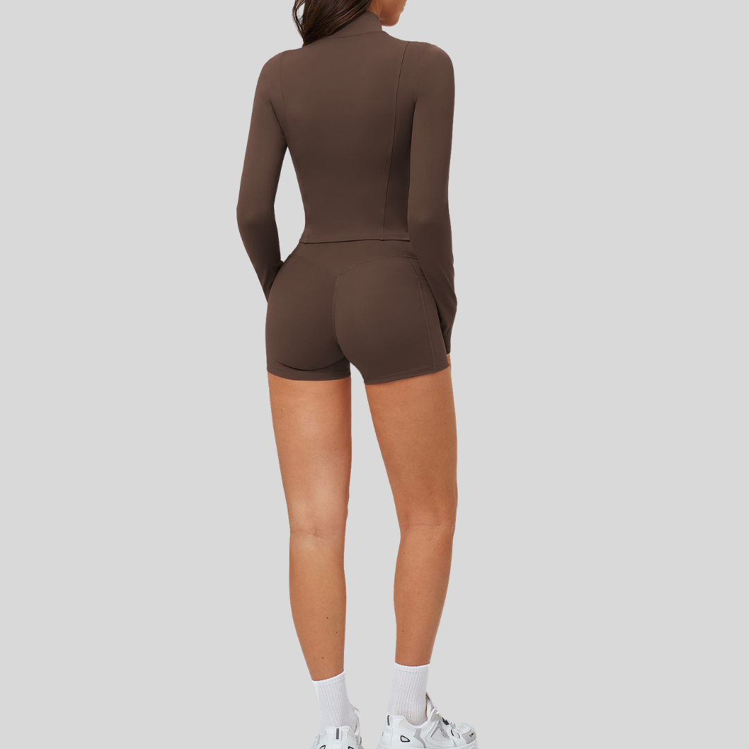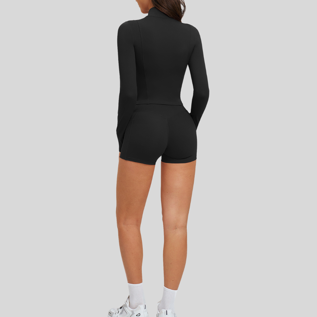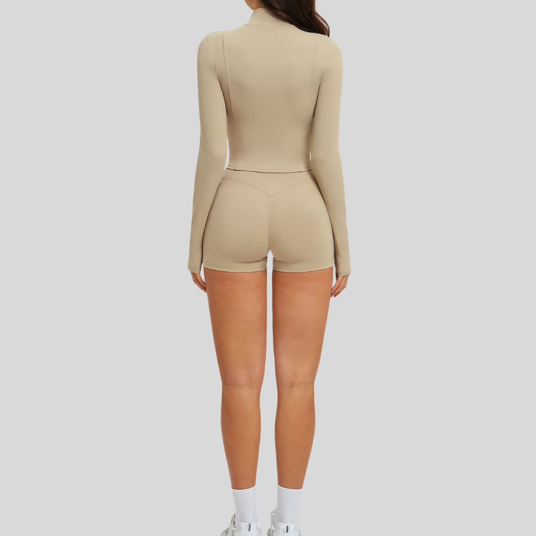 ✔ Complete 3-Piece Look – Jacket, bra, and shorts in one set.