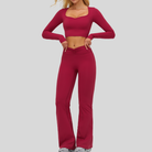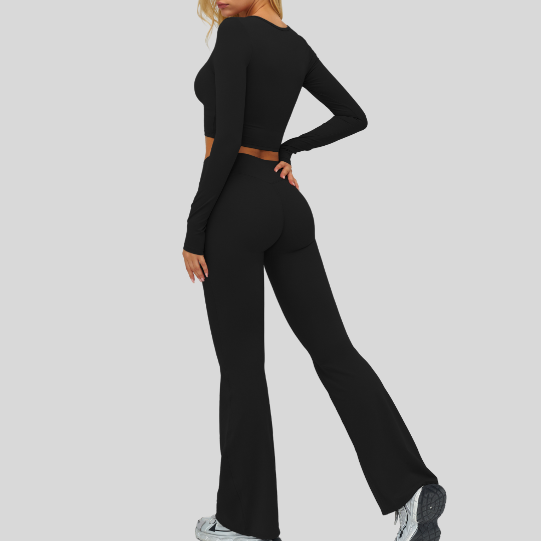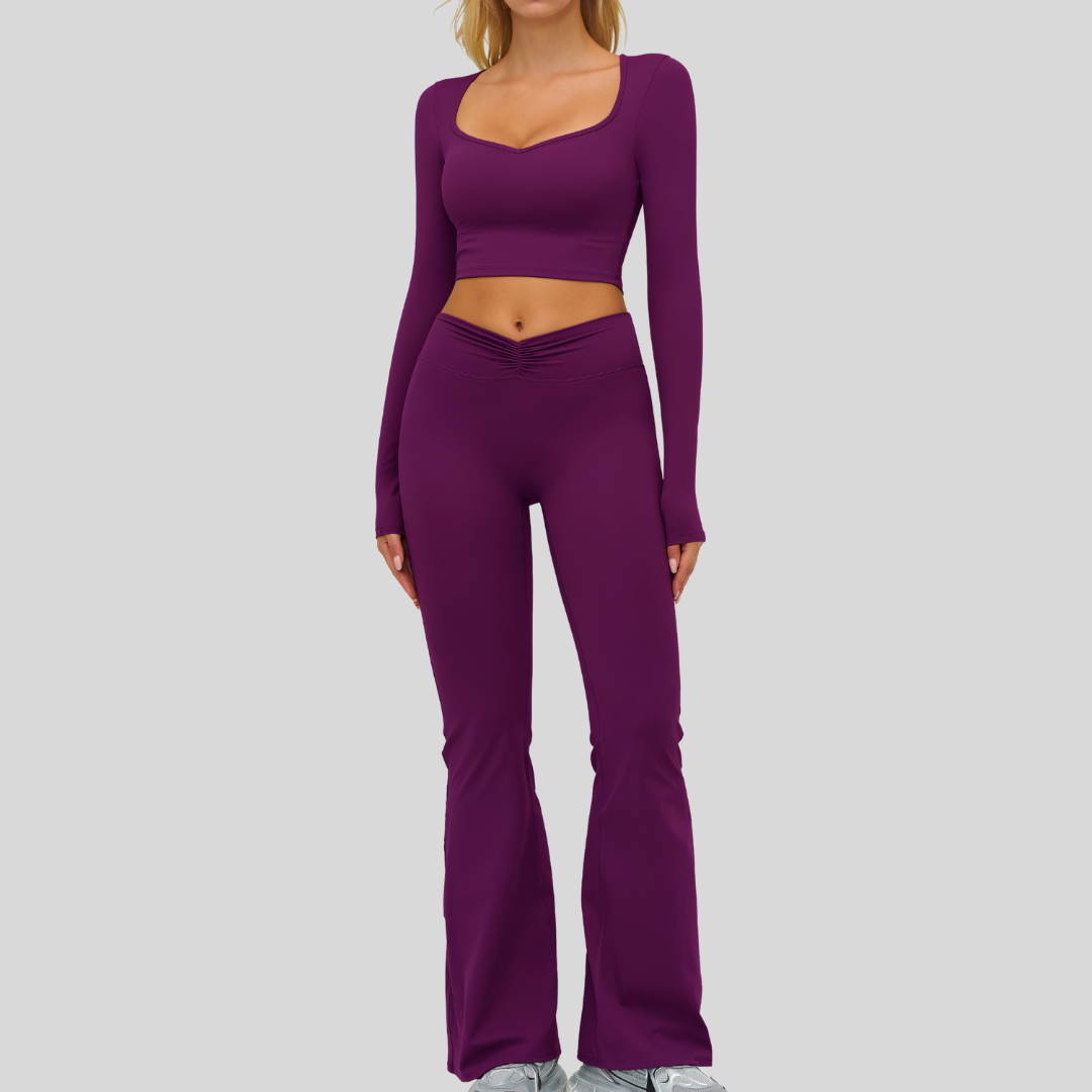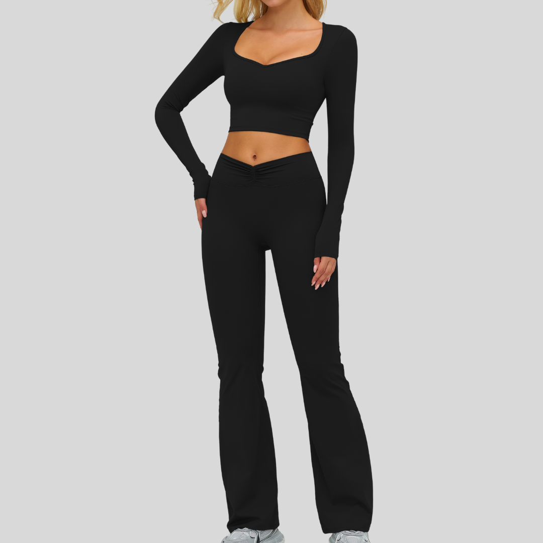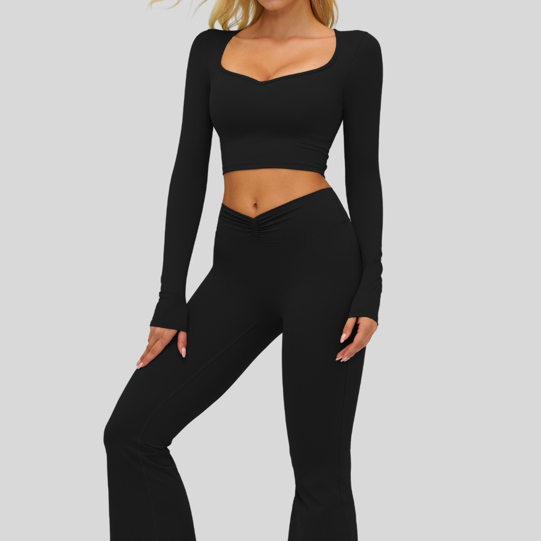 Designed for fluid movement and feminine structure. Désirée brings together a sleek long sleeve top and softly flared leggings that elevate your everyday activewear.