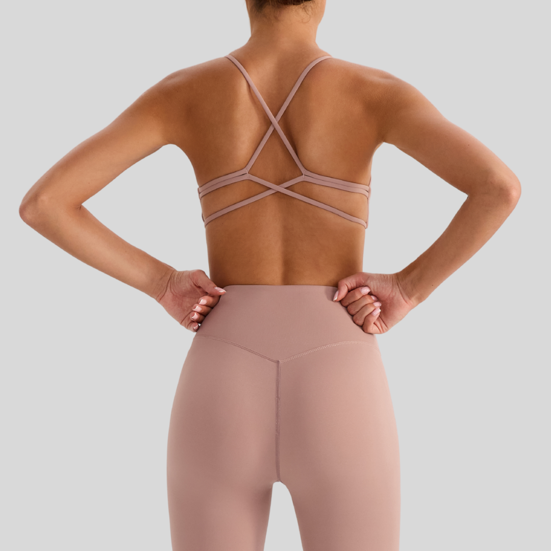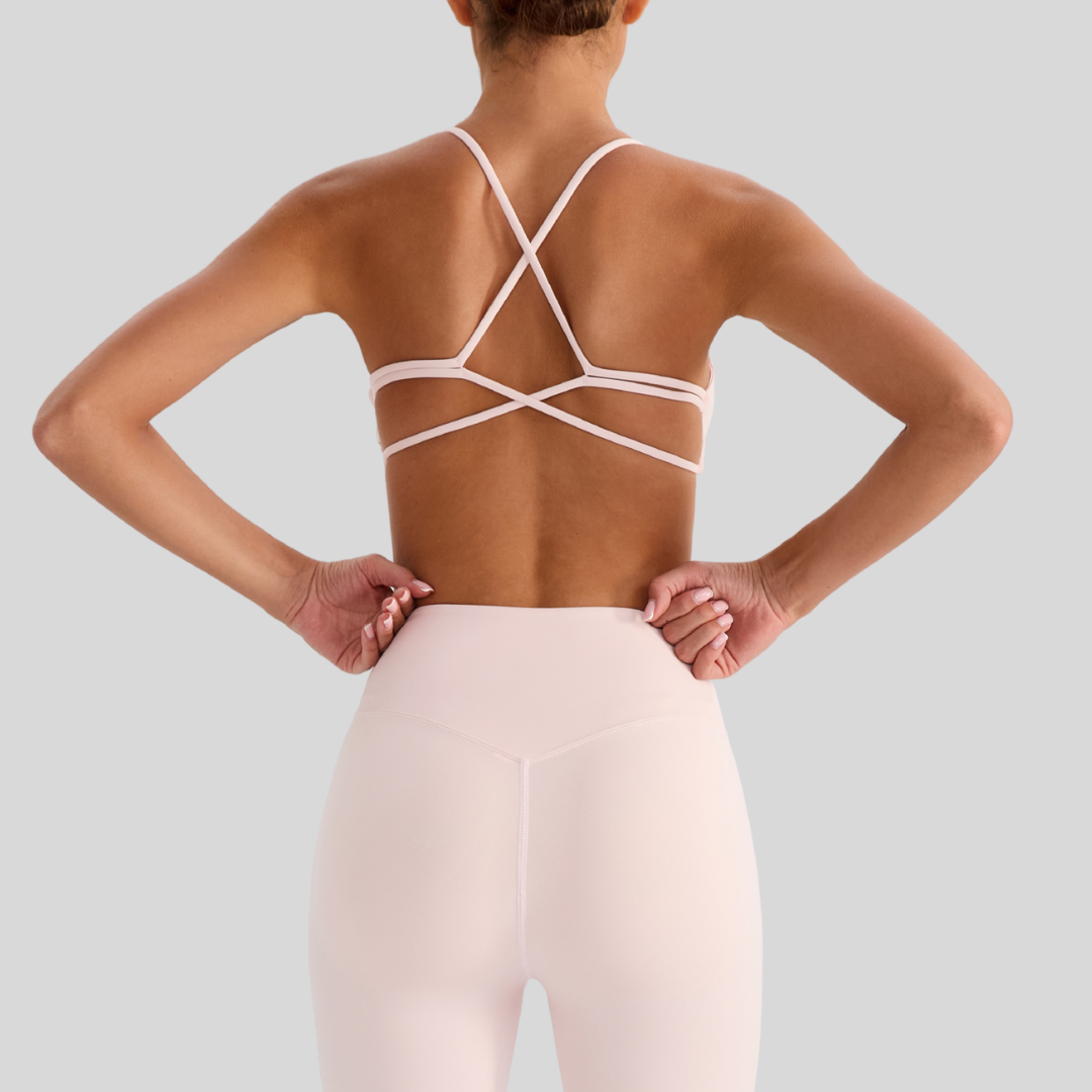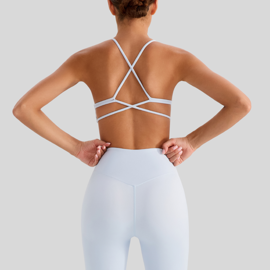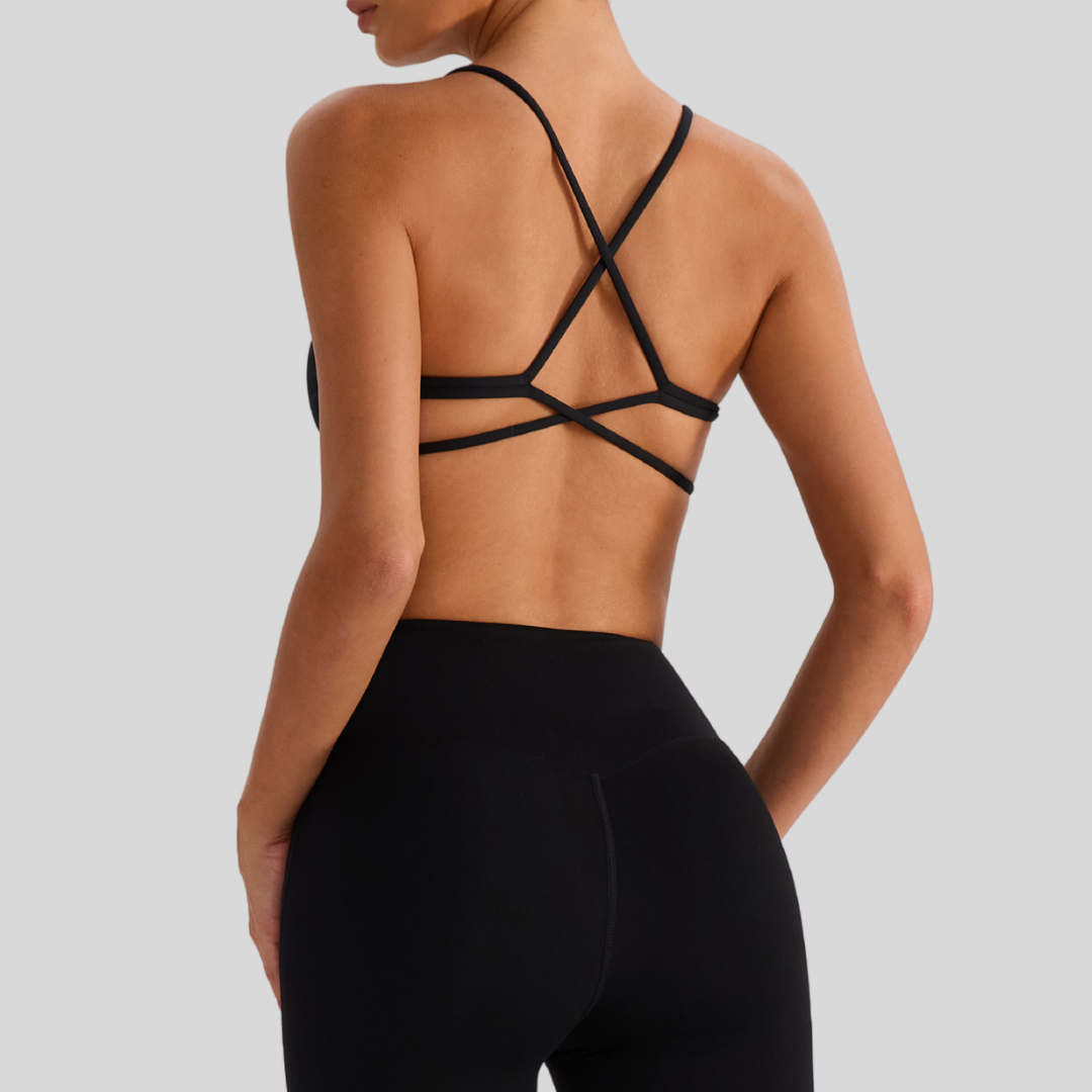 ✔ Strappy Back – Chic crisscross straps that stay put through every move.
