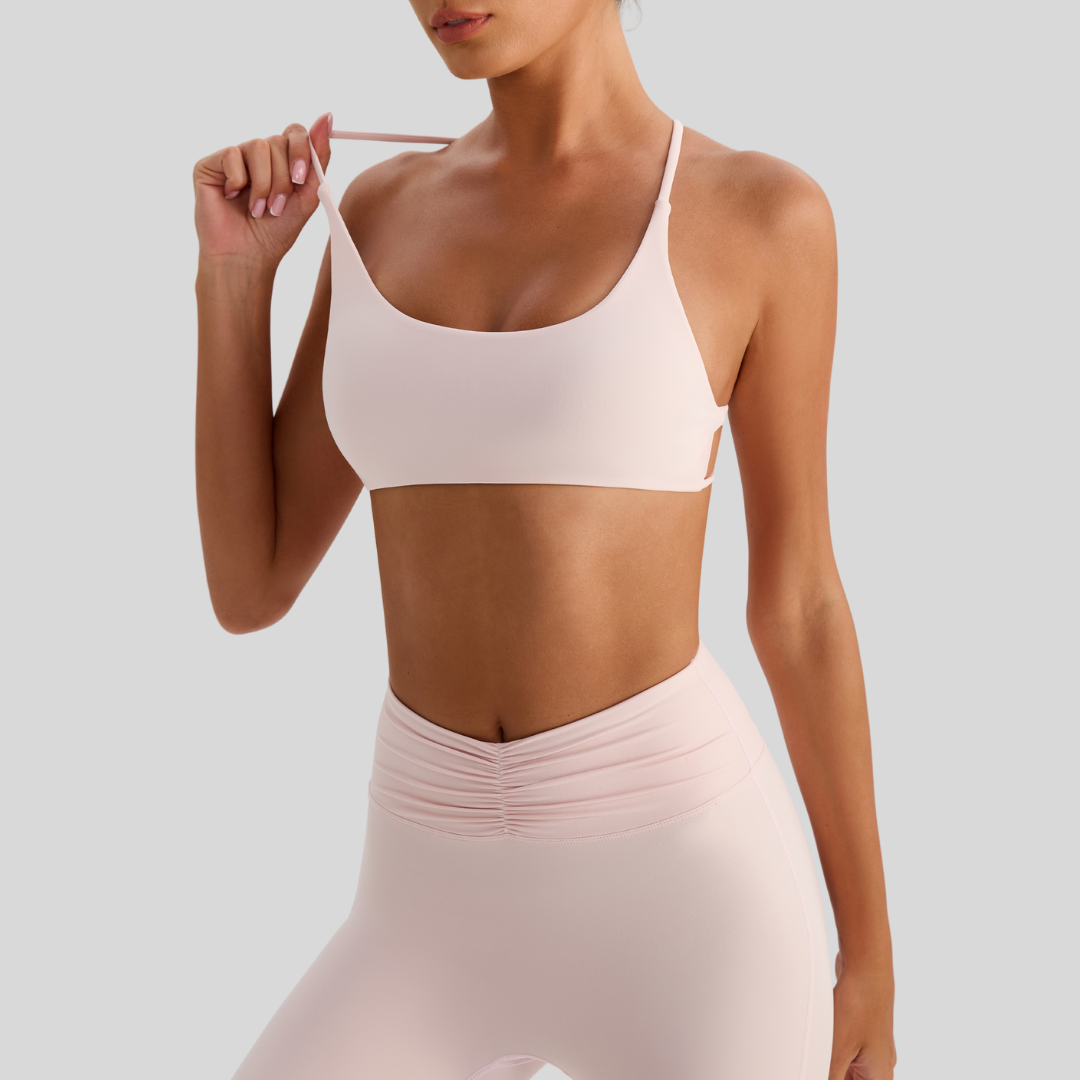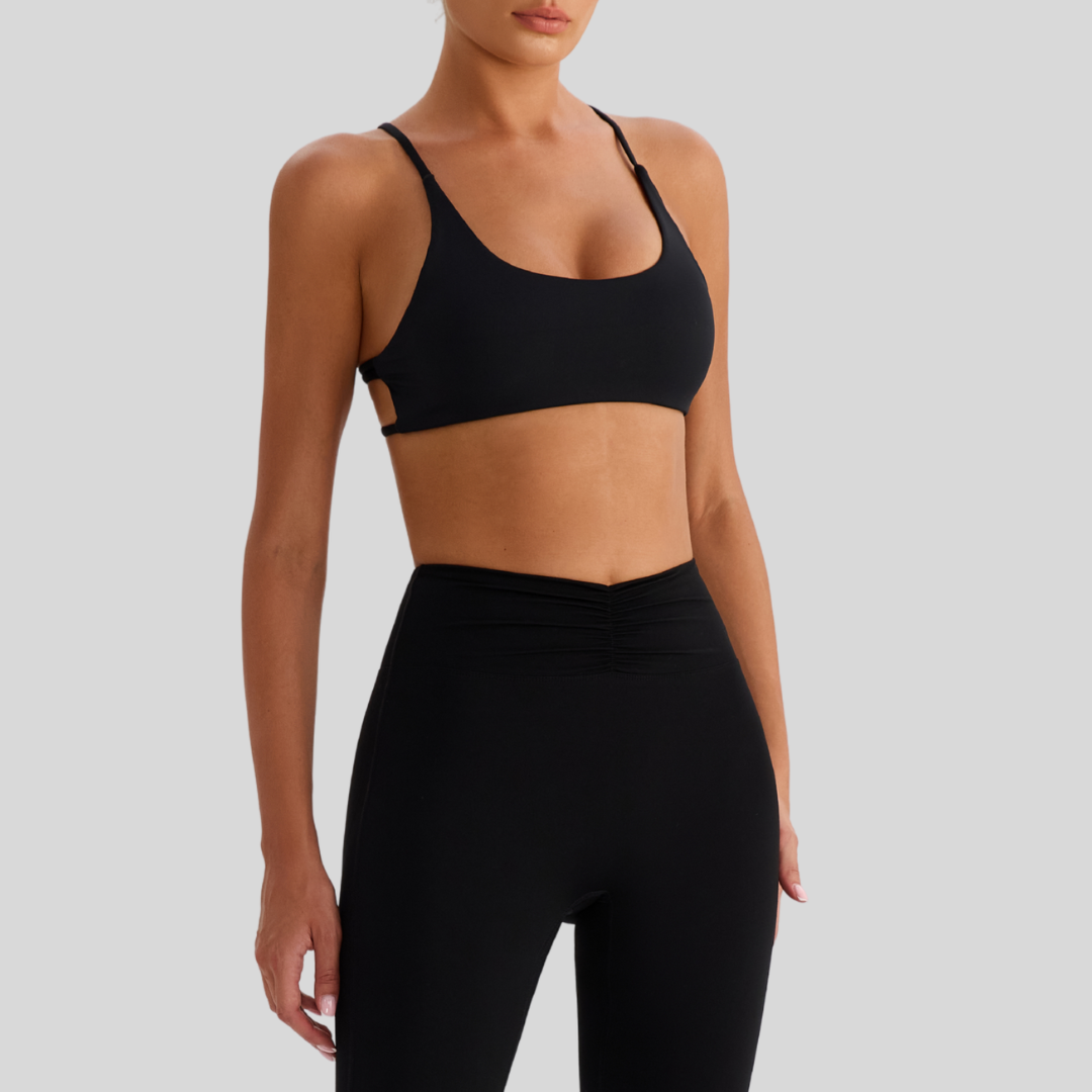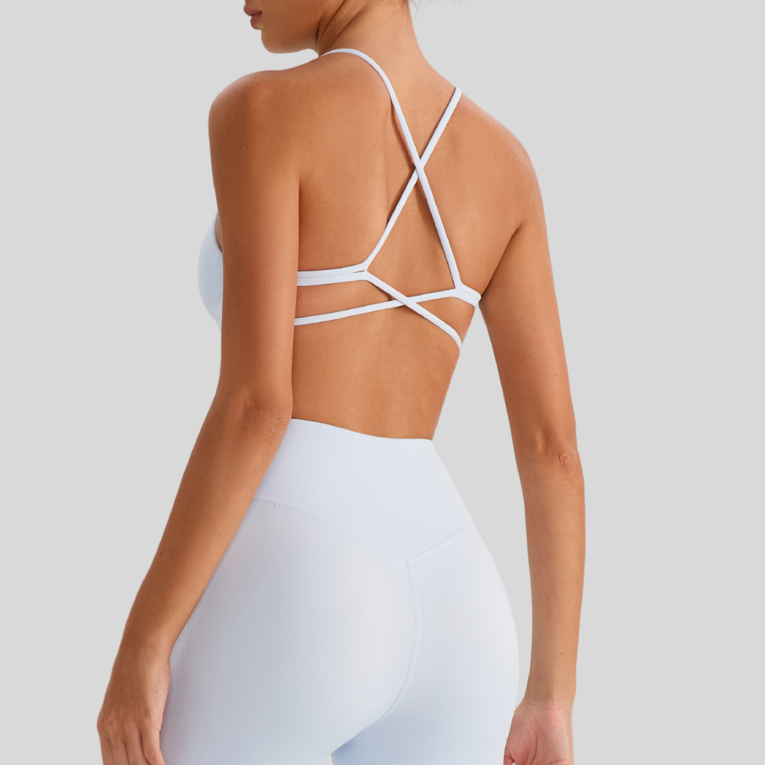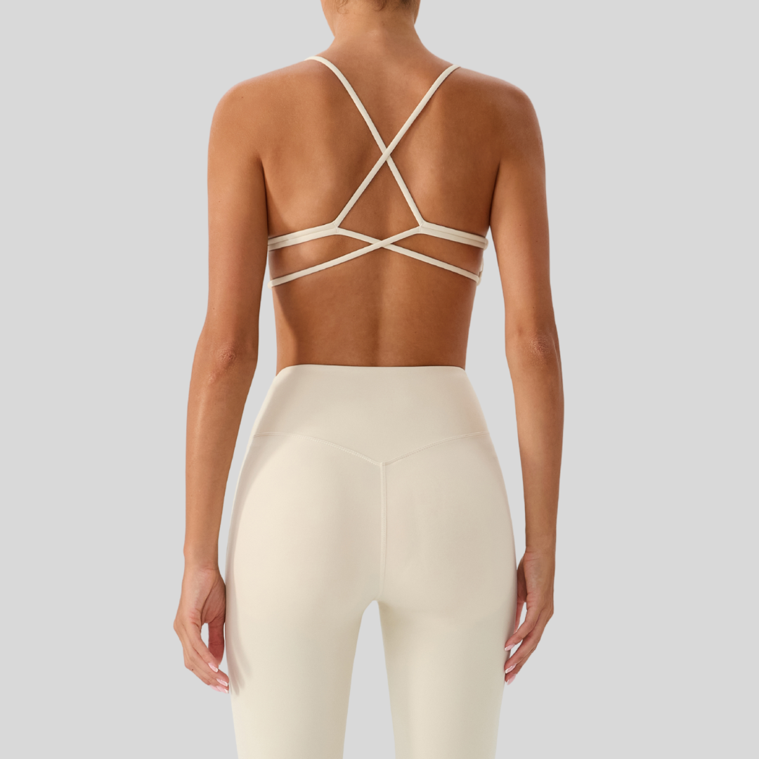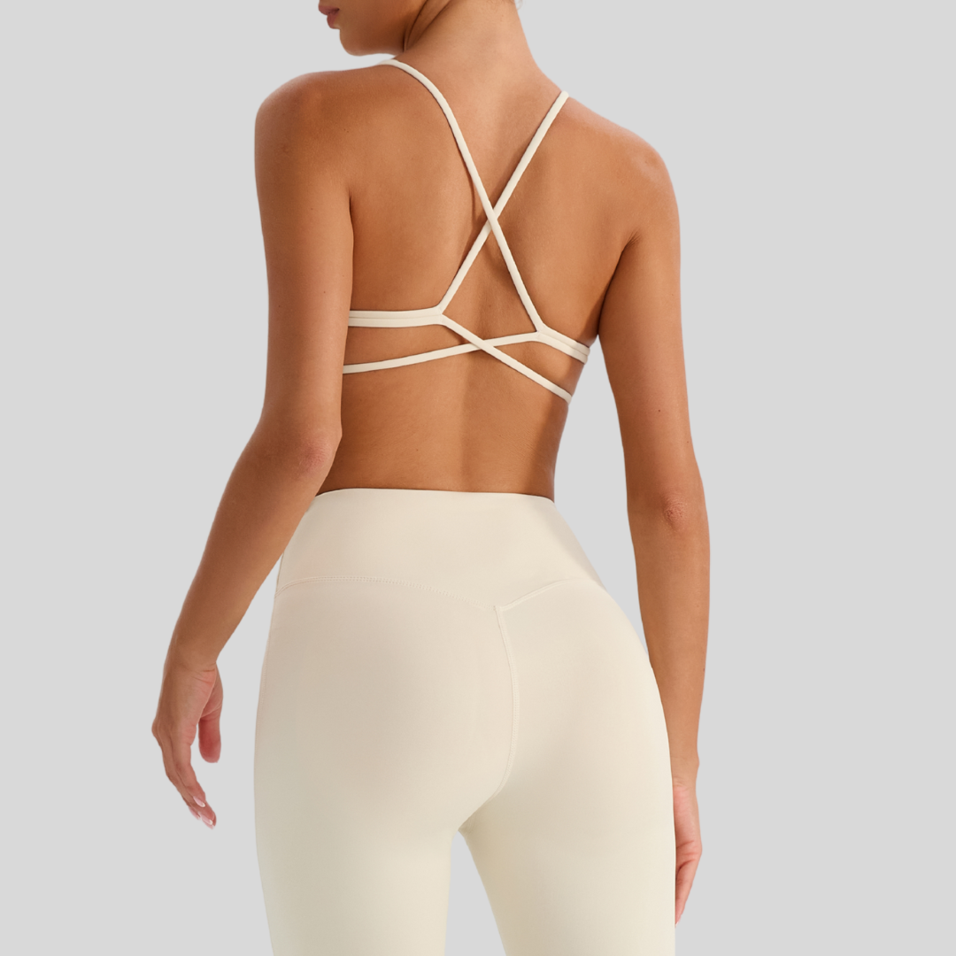 ✔ Strappy Back – Chic crisscross straps that stay put through every move.