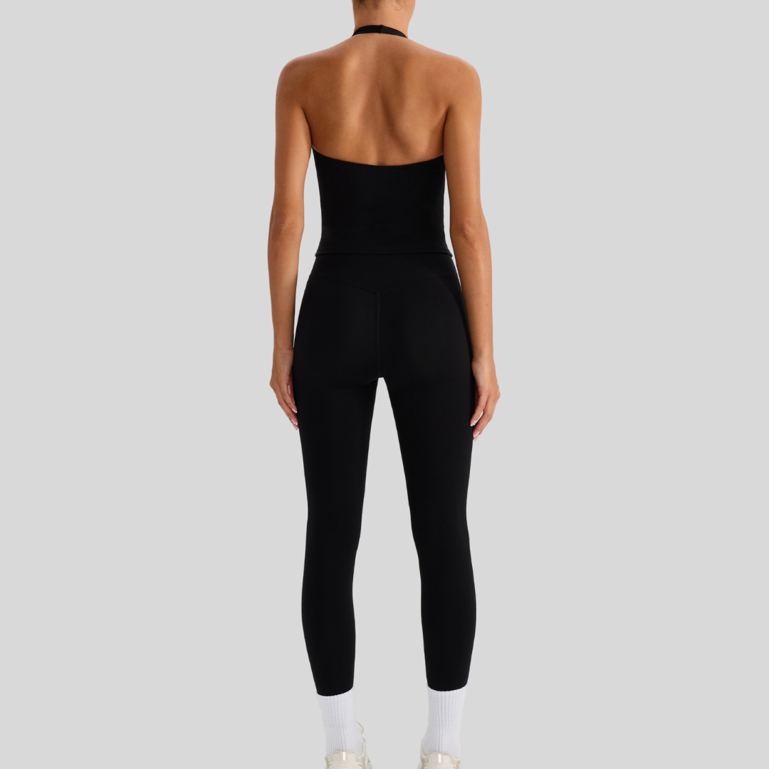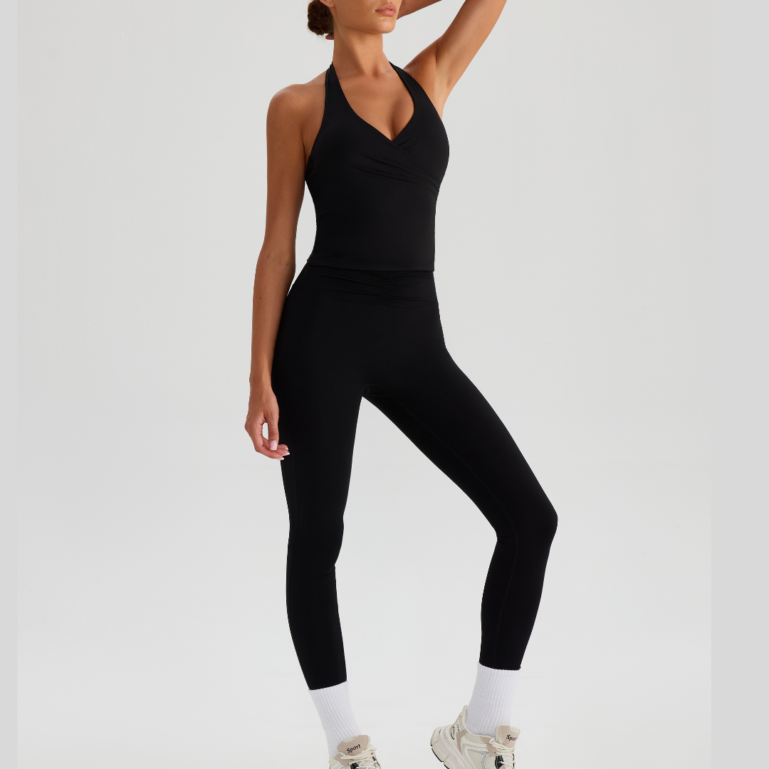 Bella is a halter top and leggings duo designed to make you feel amazing. With its sleek wrap neckline and ruched high-rise leggings, it blends chic style with effortless comfort. The Align Fabric (75% nylon + 25% spandex) makes it smooth, flexible, and ready for anything.