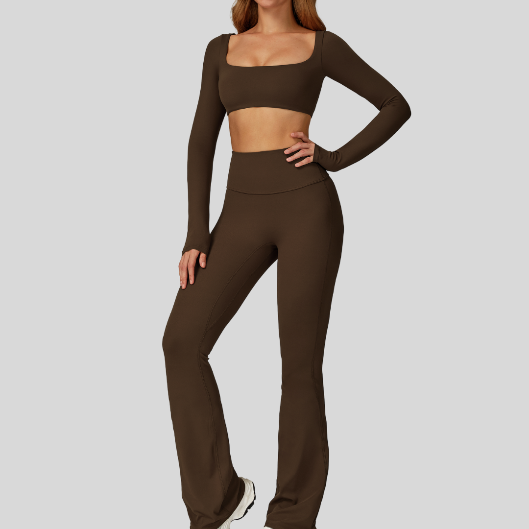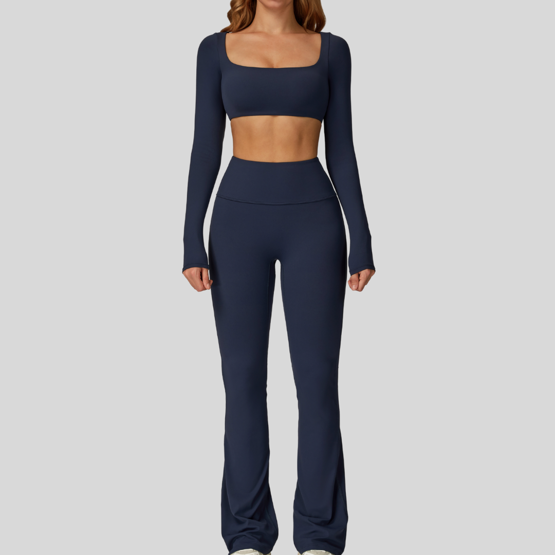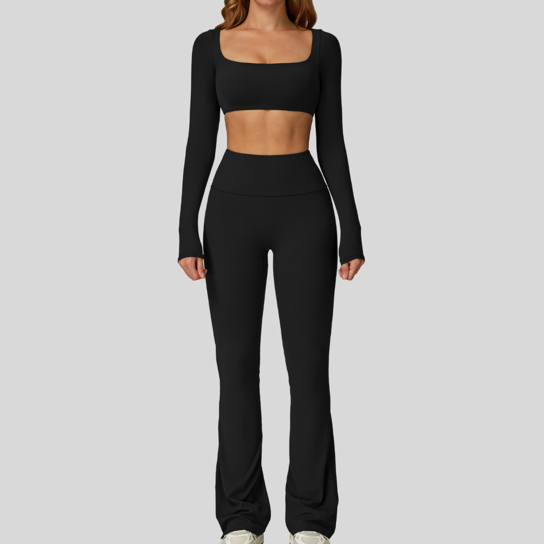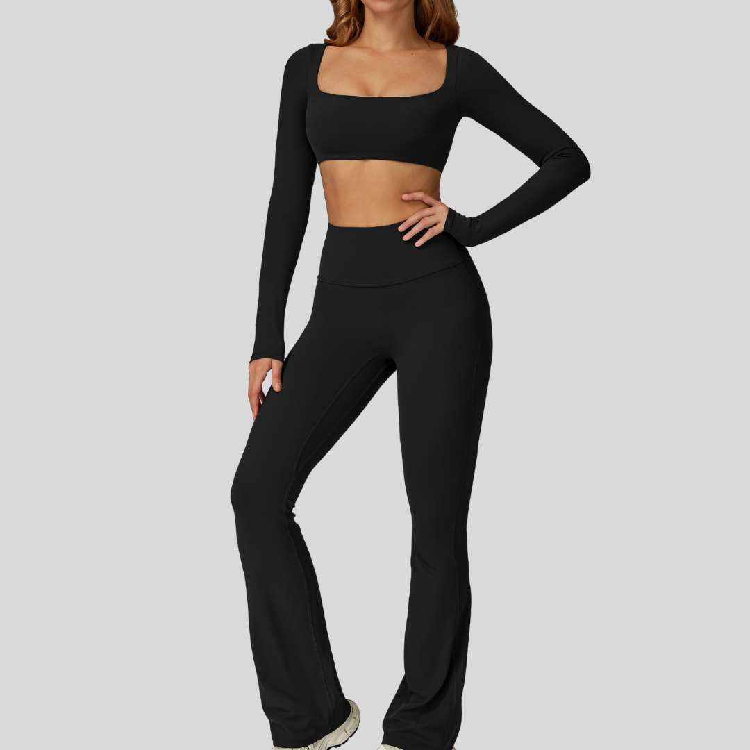 Kelly brings together sleek lines and sculpting softness. With a square neckline and flared leggings, it’s the perfect mix of strength and femininity; a look that flows with your every move.