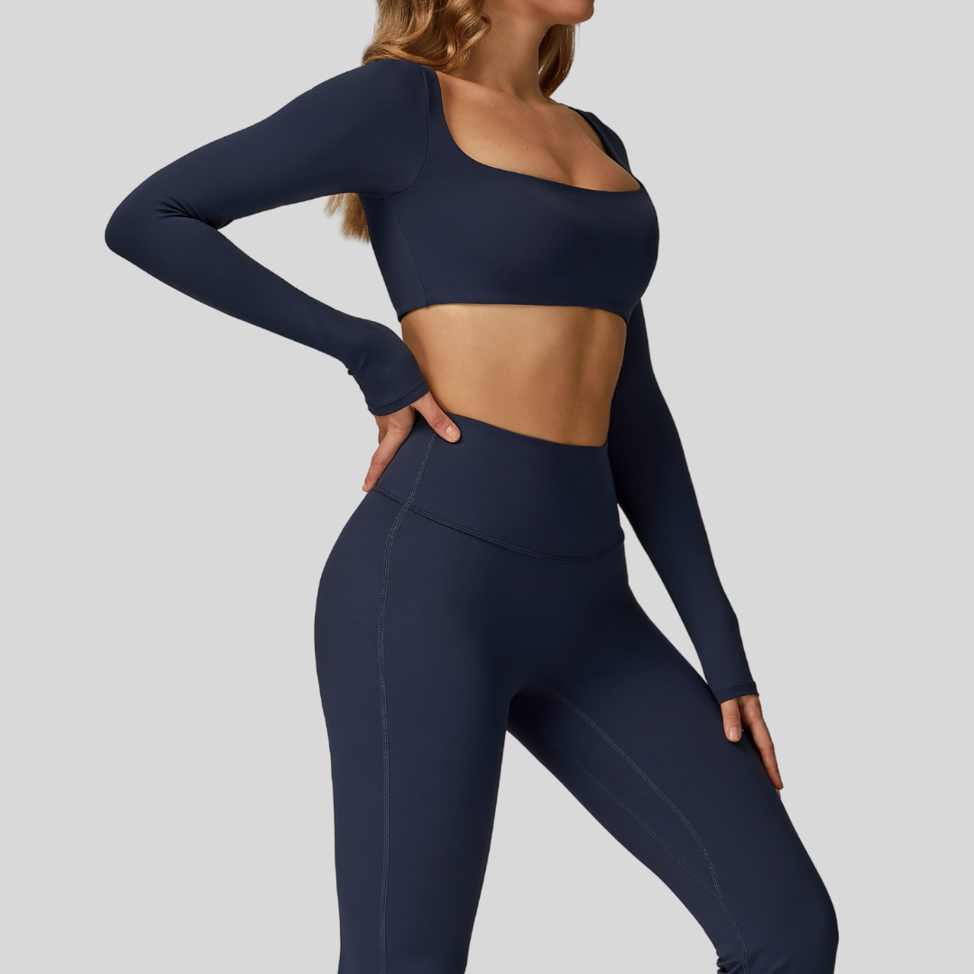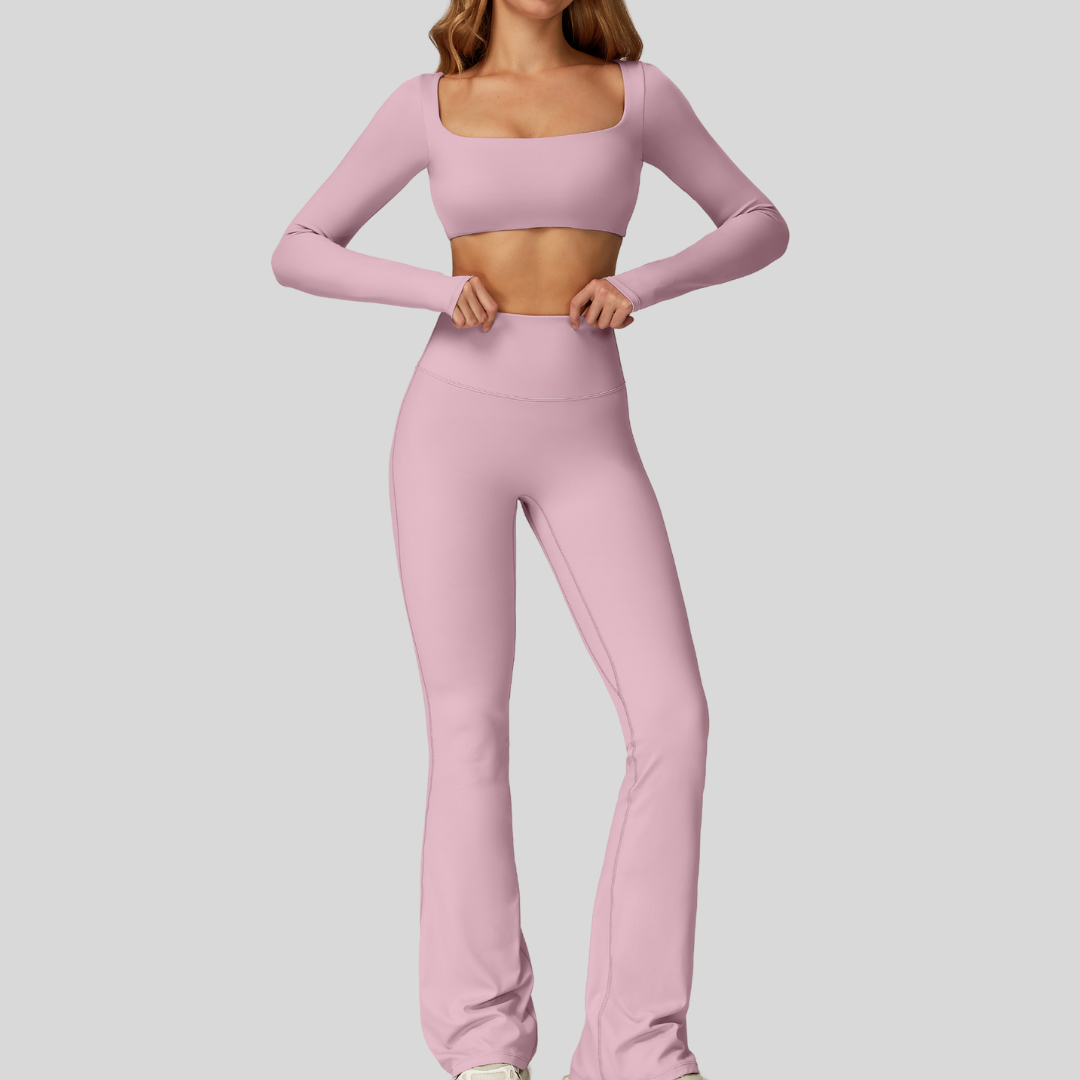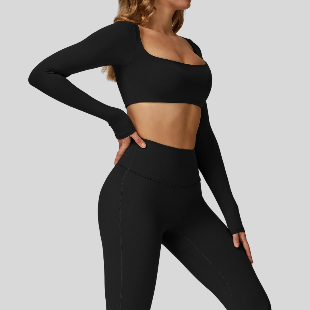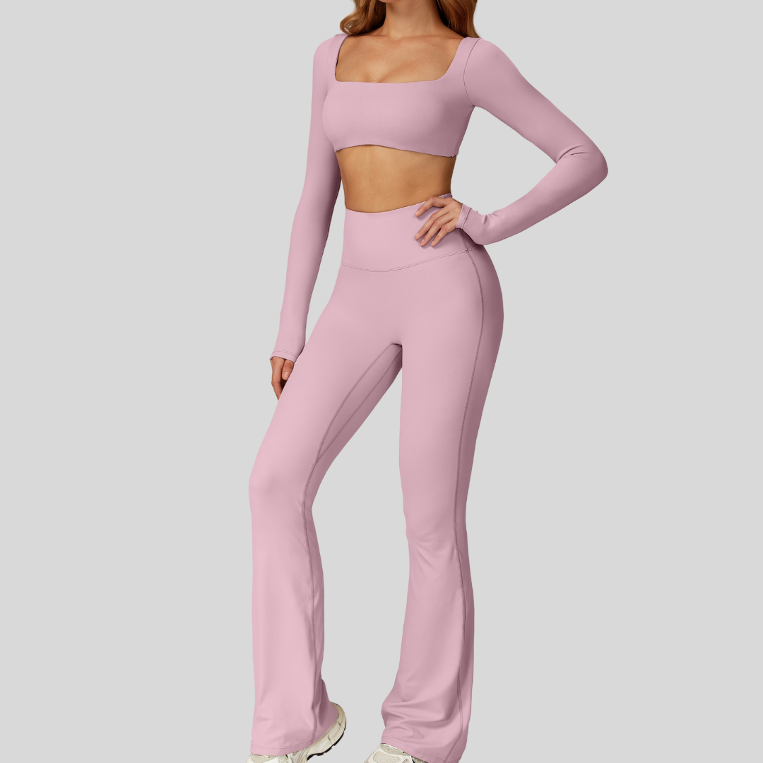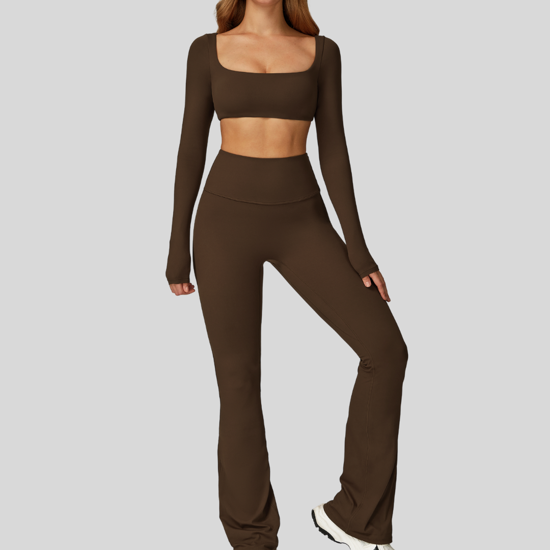 Kelly brings together sleek lines and sculpting softness. With a square neckline and flared leggings, it’s the perfect mix of strength and femininity; a look that flows with your every move.