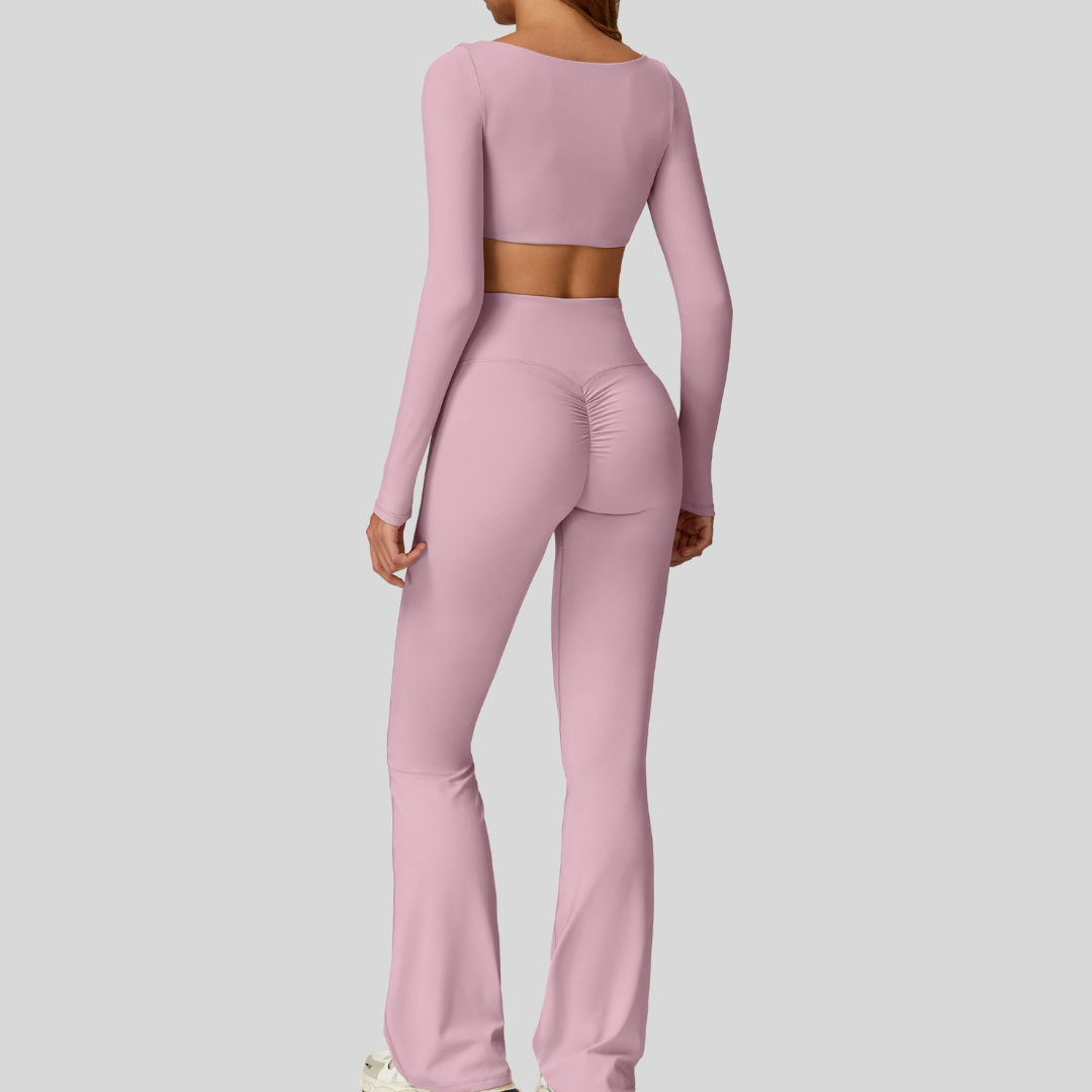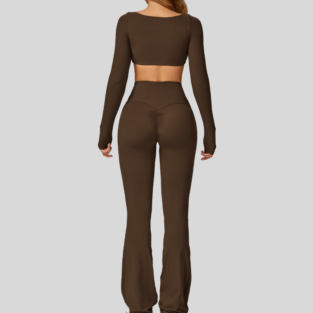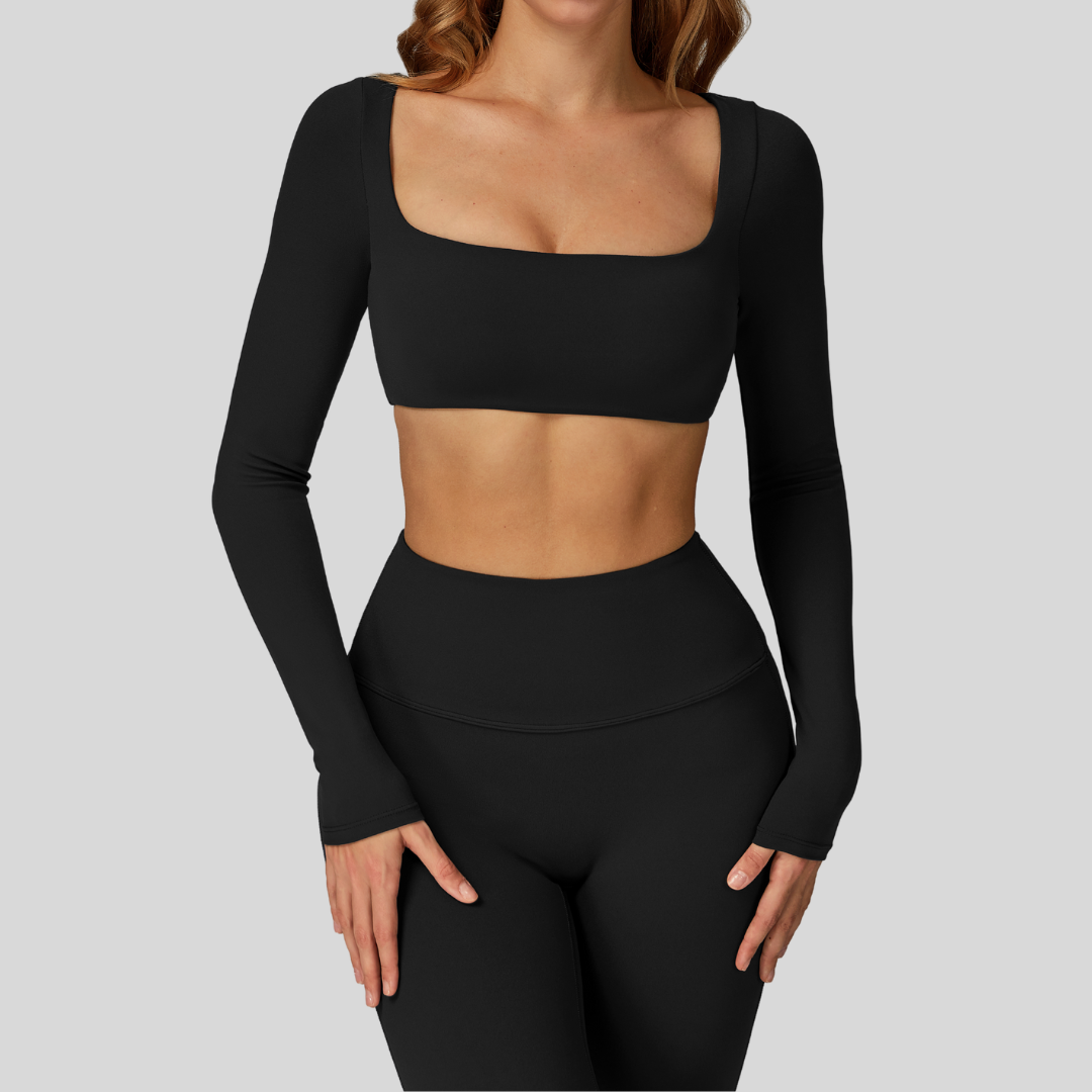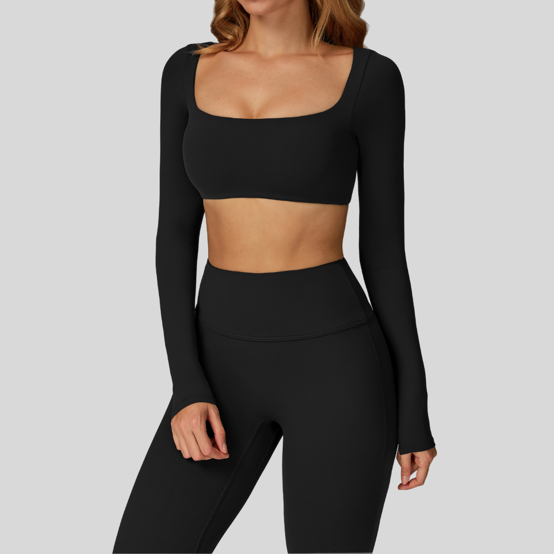 Kelly brings together sleek lines and sculpting softness. With a square neckline and flared leggings, it’s the perfect mix of strength and femininity; a look that flows with your every move.
