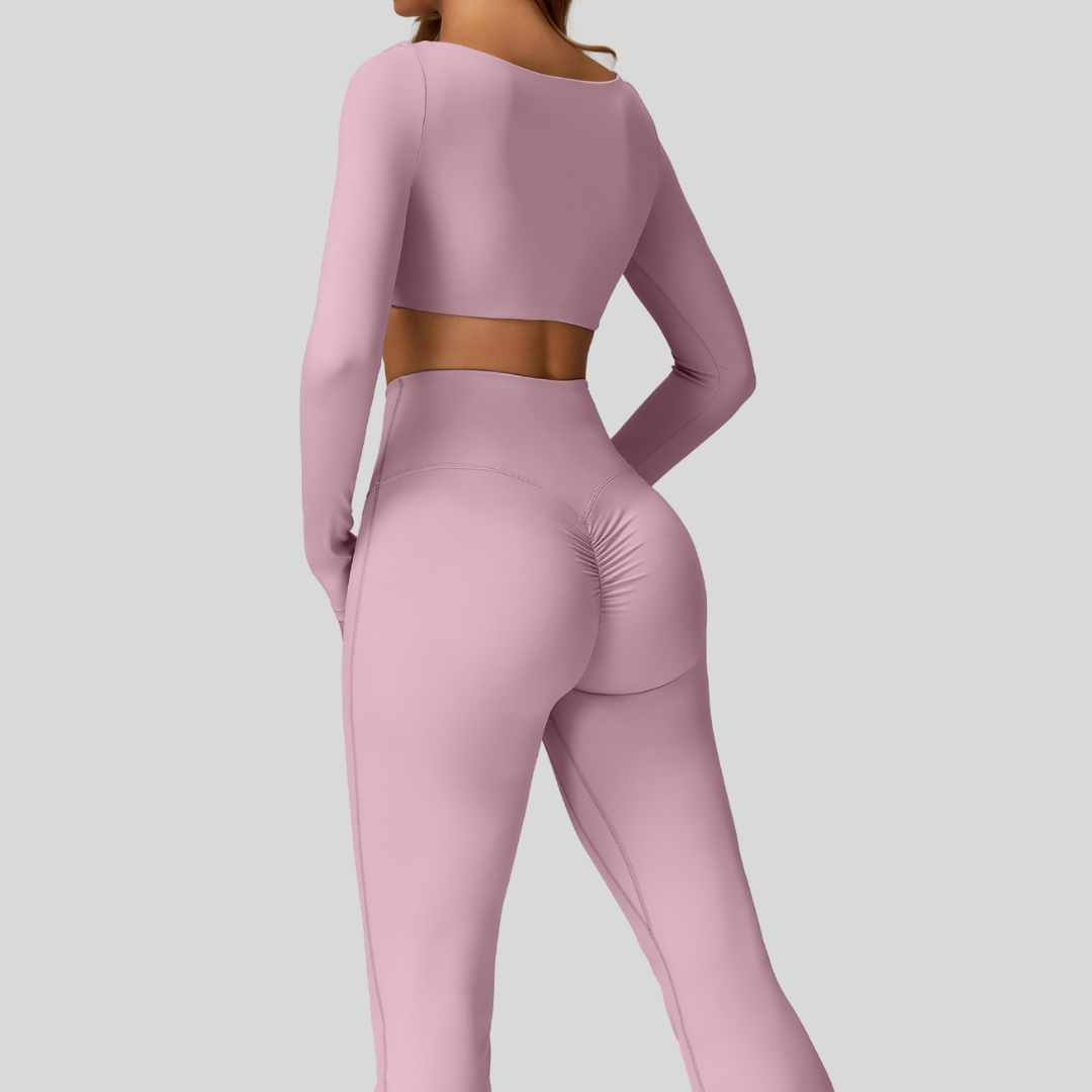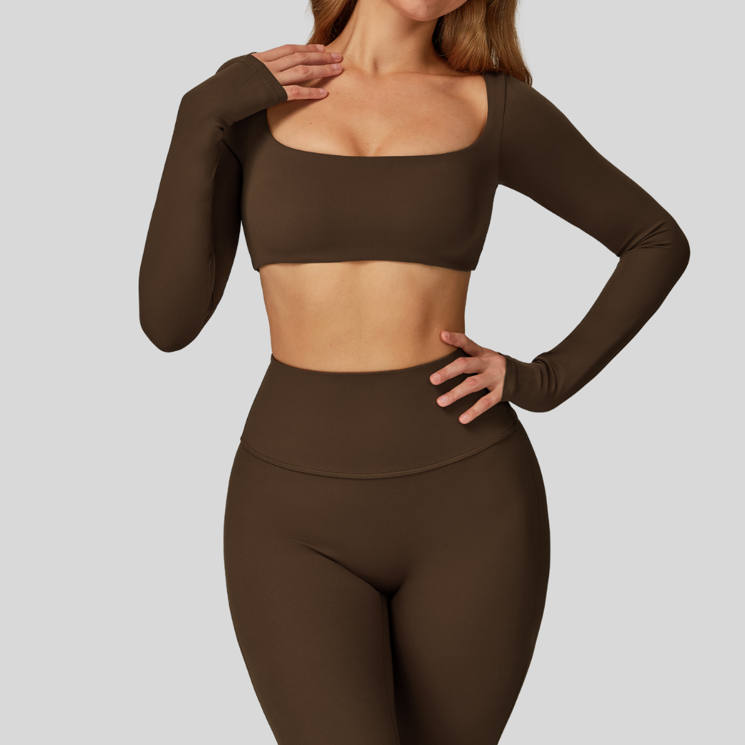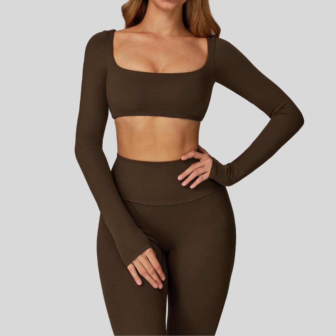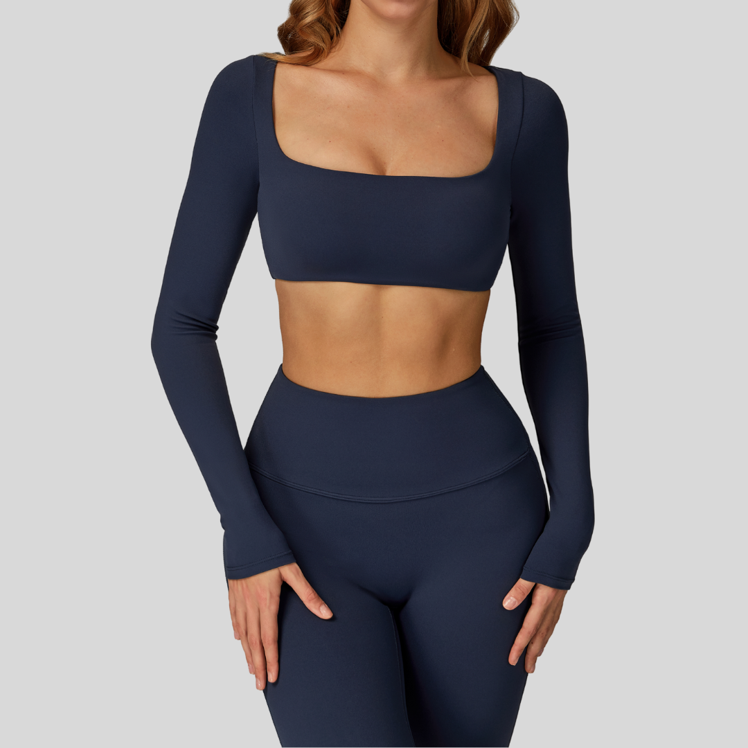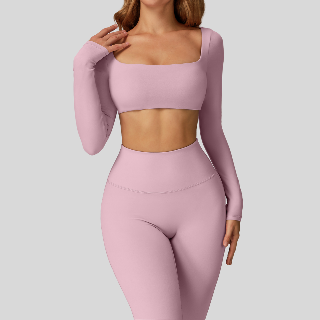 Kelly brings together sleek lines and sculpting softness. With a square neckline and flared leggings, it’s the perfect mix of strength and femininity; a look that flows with your every move.