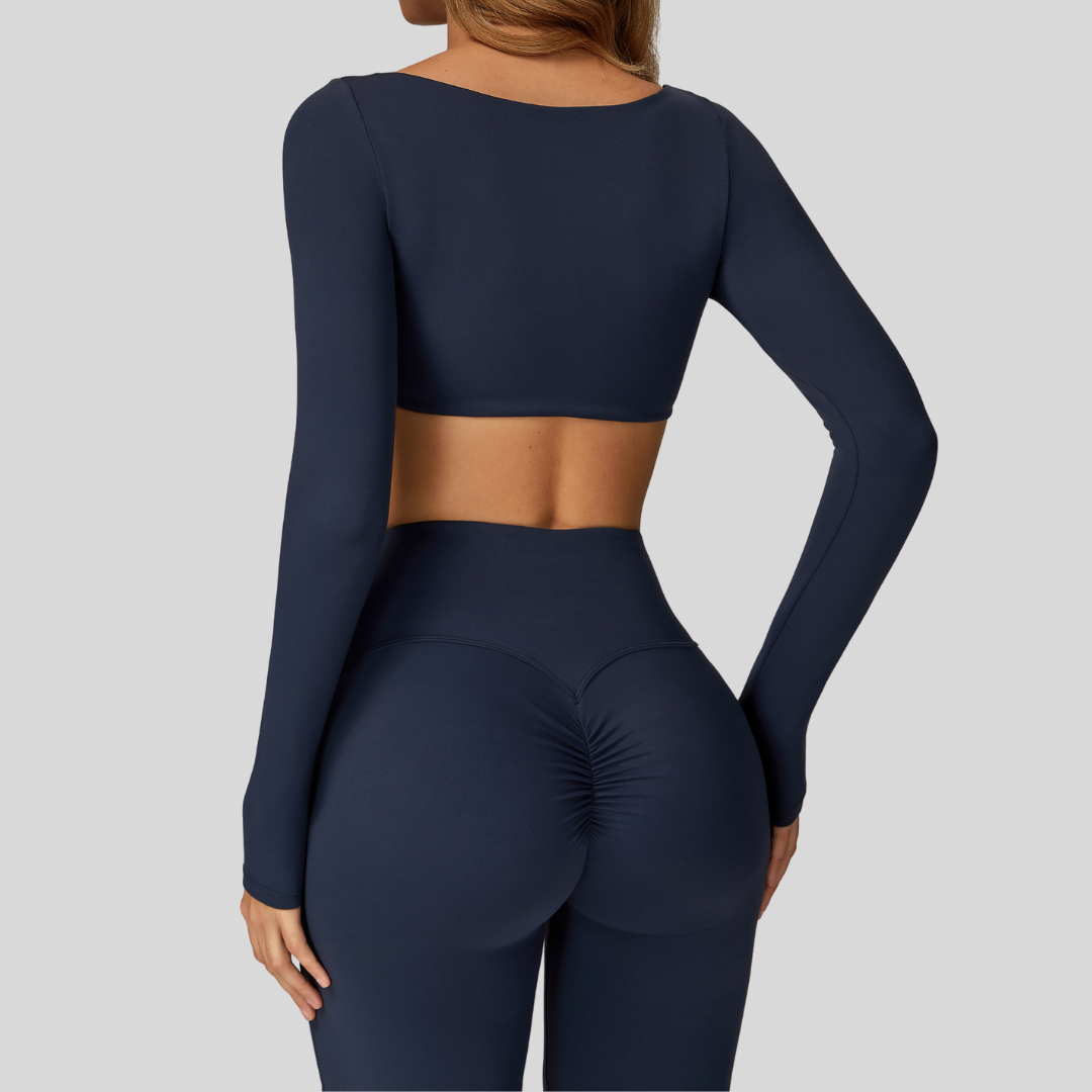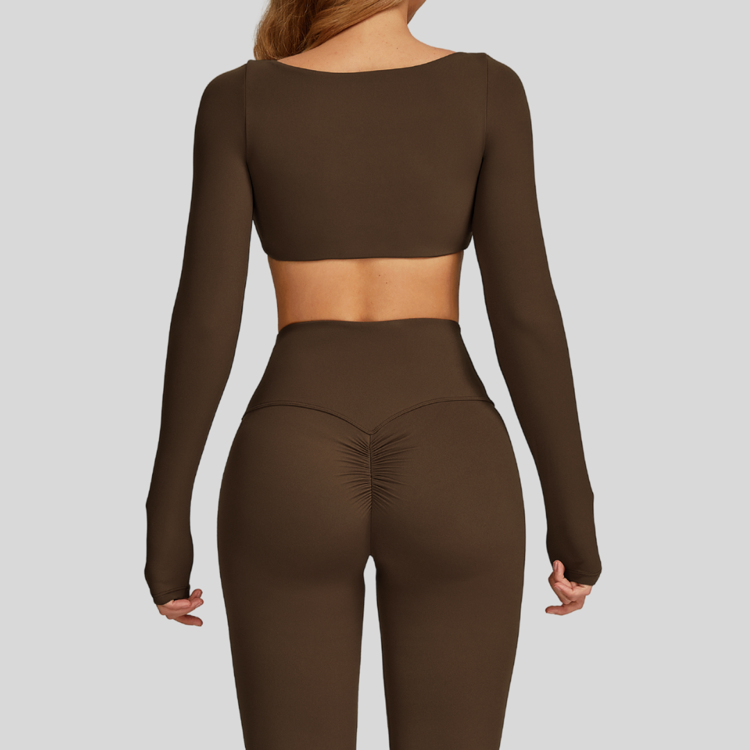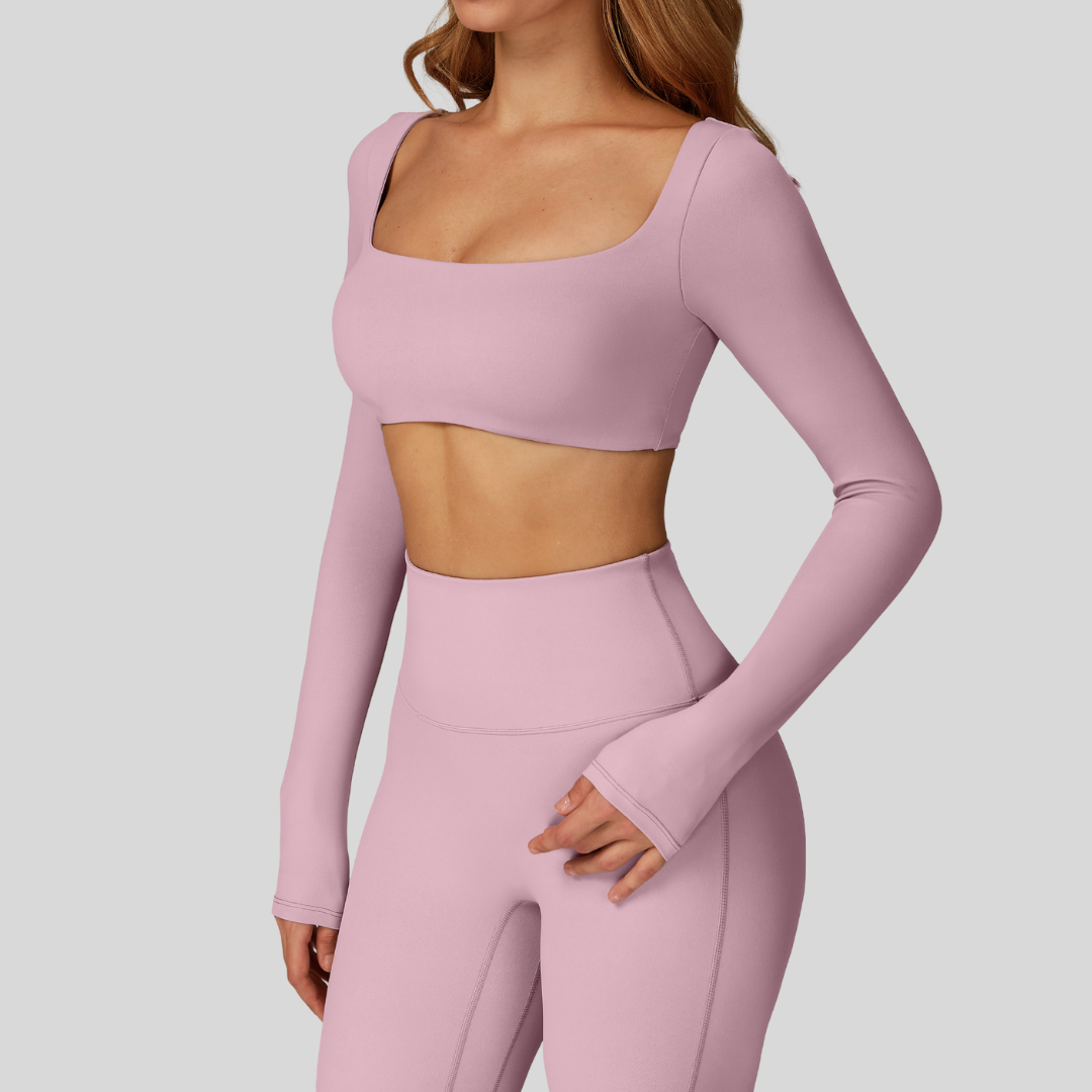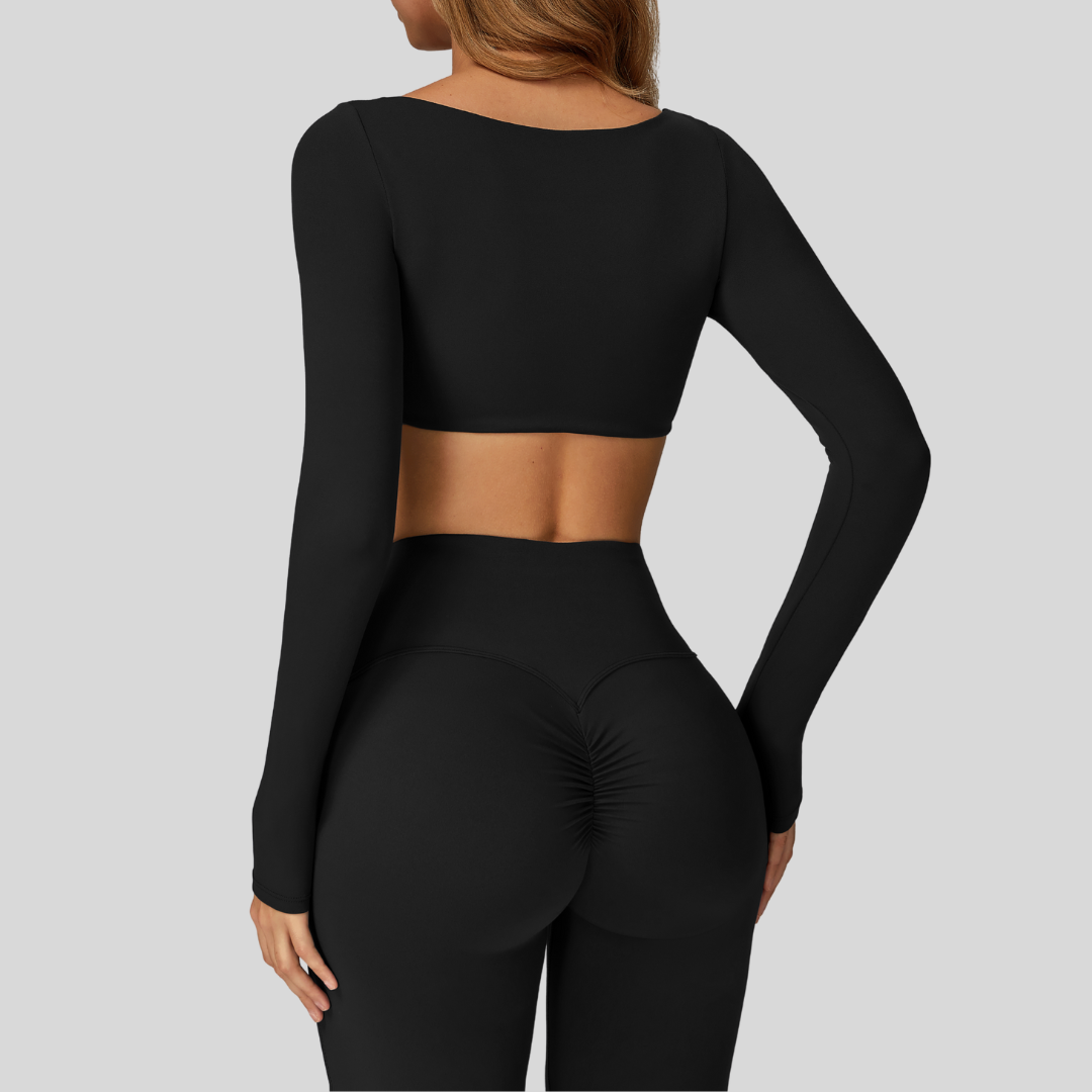 Kelly brings together sleek lines and sculpting softness. With a square neckline and flared leggings, it’s the perfect mix of strength and femininity; a look that flows with your every move.